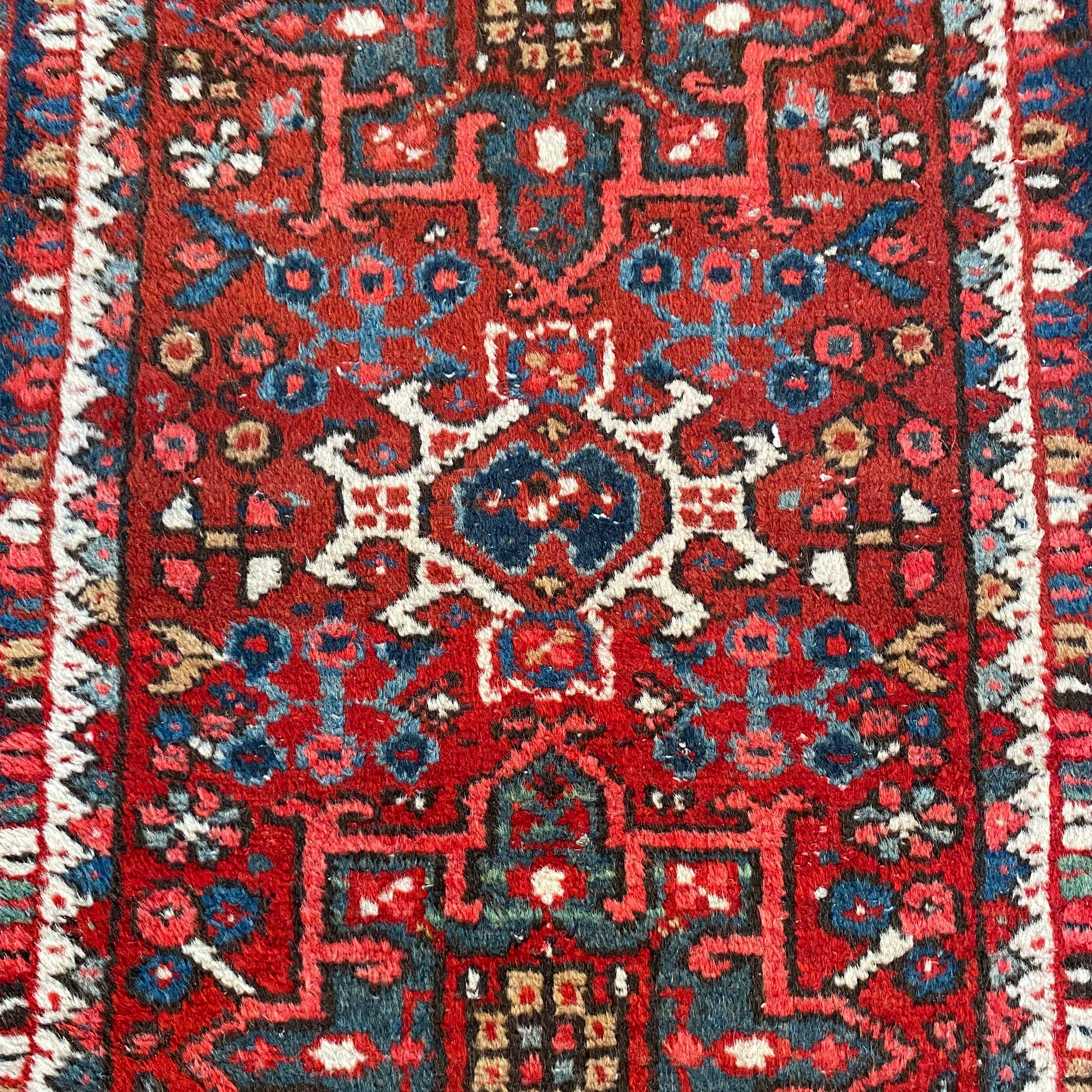 This vintage rug is in very good condition. The design features tribal medallions set in a red field with blue and white highlights. There is wear on the edges, fringe ends and throughout.