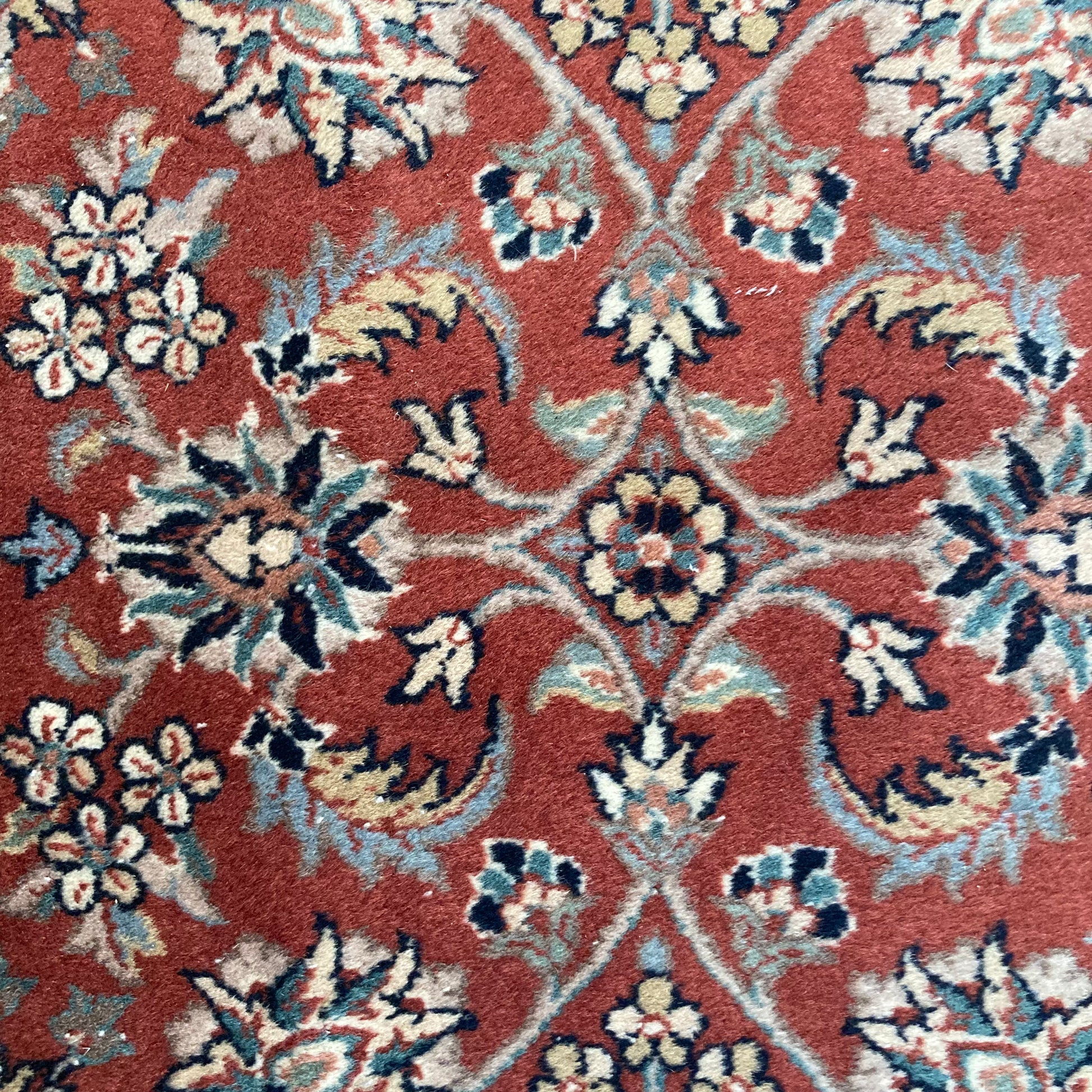This vintage rug is in very good condition. The design features an all-over pattern set in a light maroon field with blue and cream highlights. There is light wear throughout.