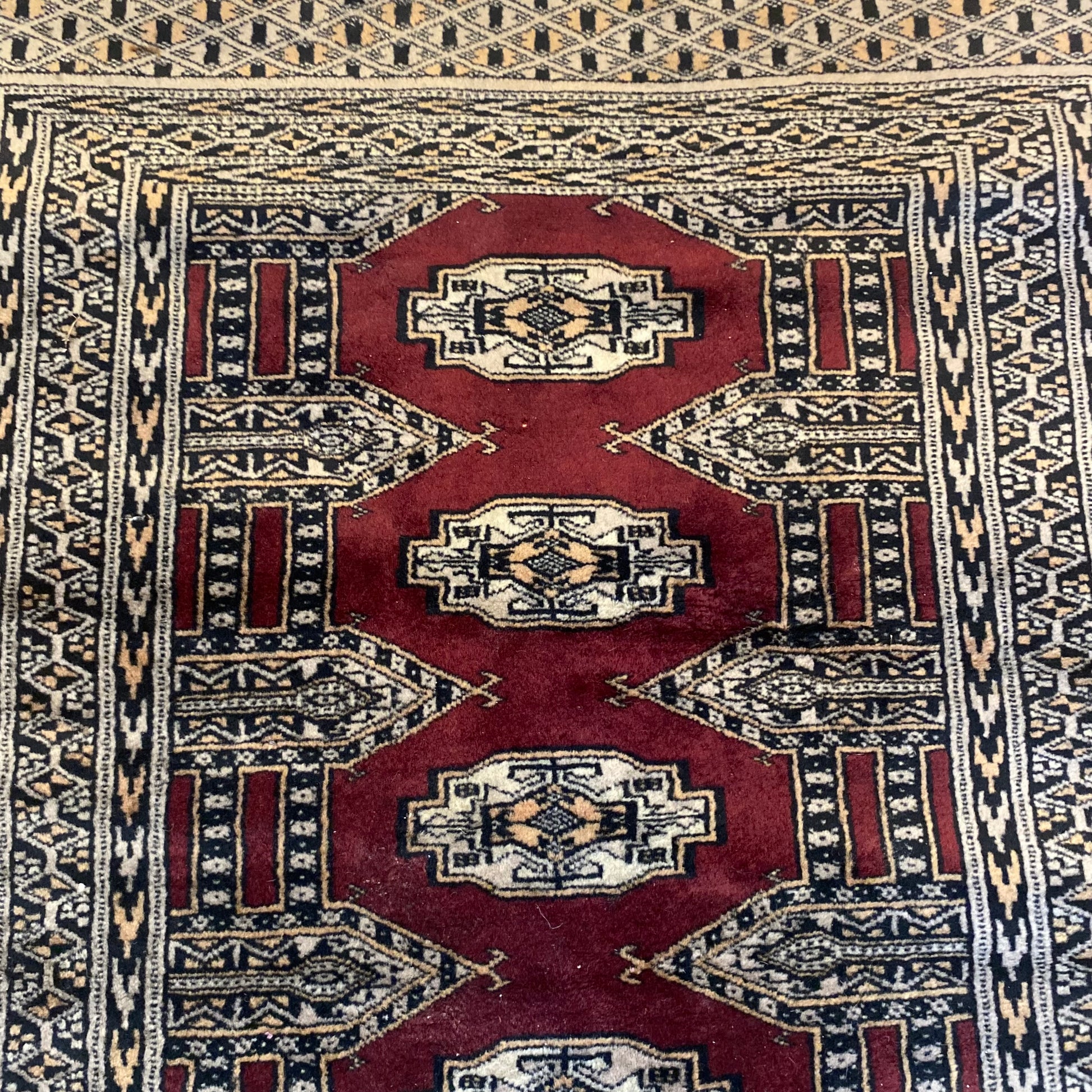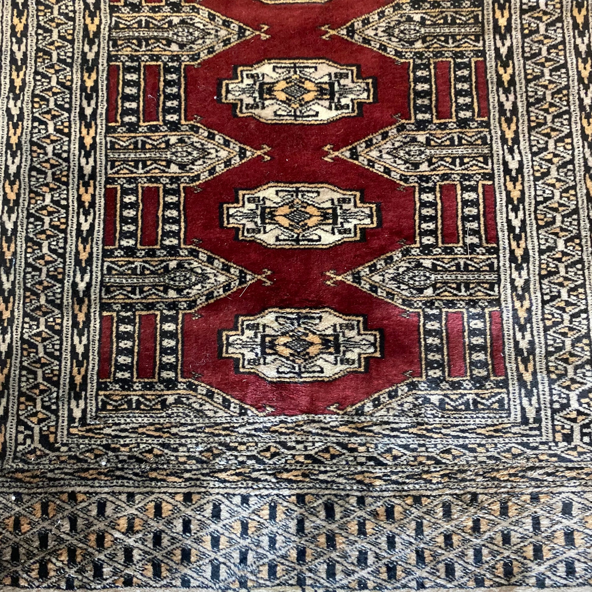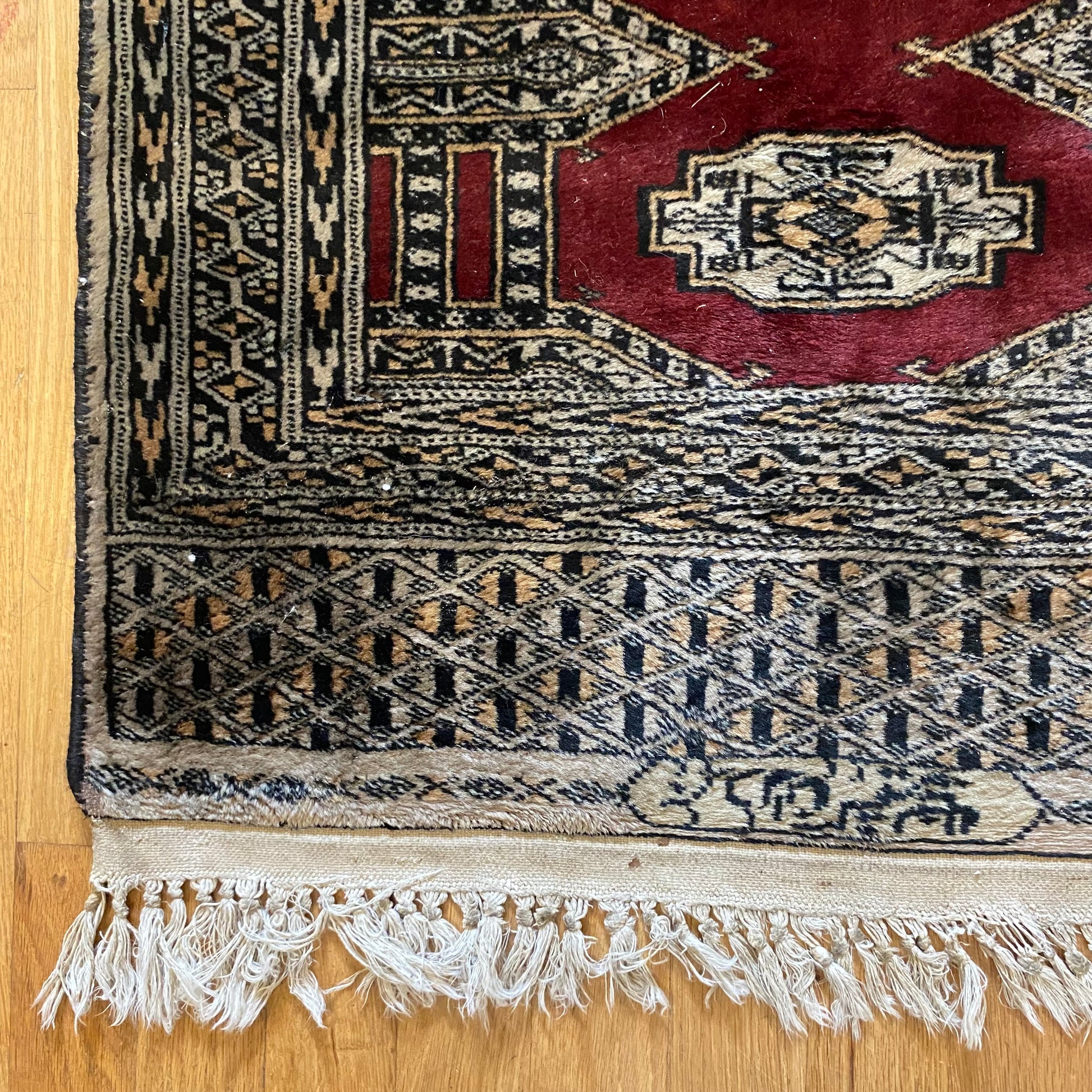 This vintage rug is in poor condition. The design features traditional medallions set in a red field with grey and gold highlights. There is wear on the edges, fringe ends and throughout. The fringe ends are worn and discolored as seen in the photos.