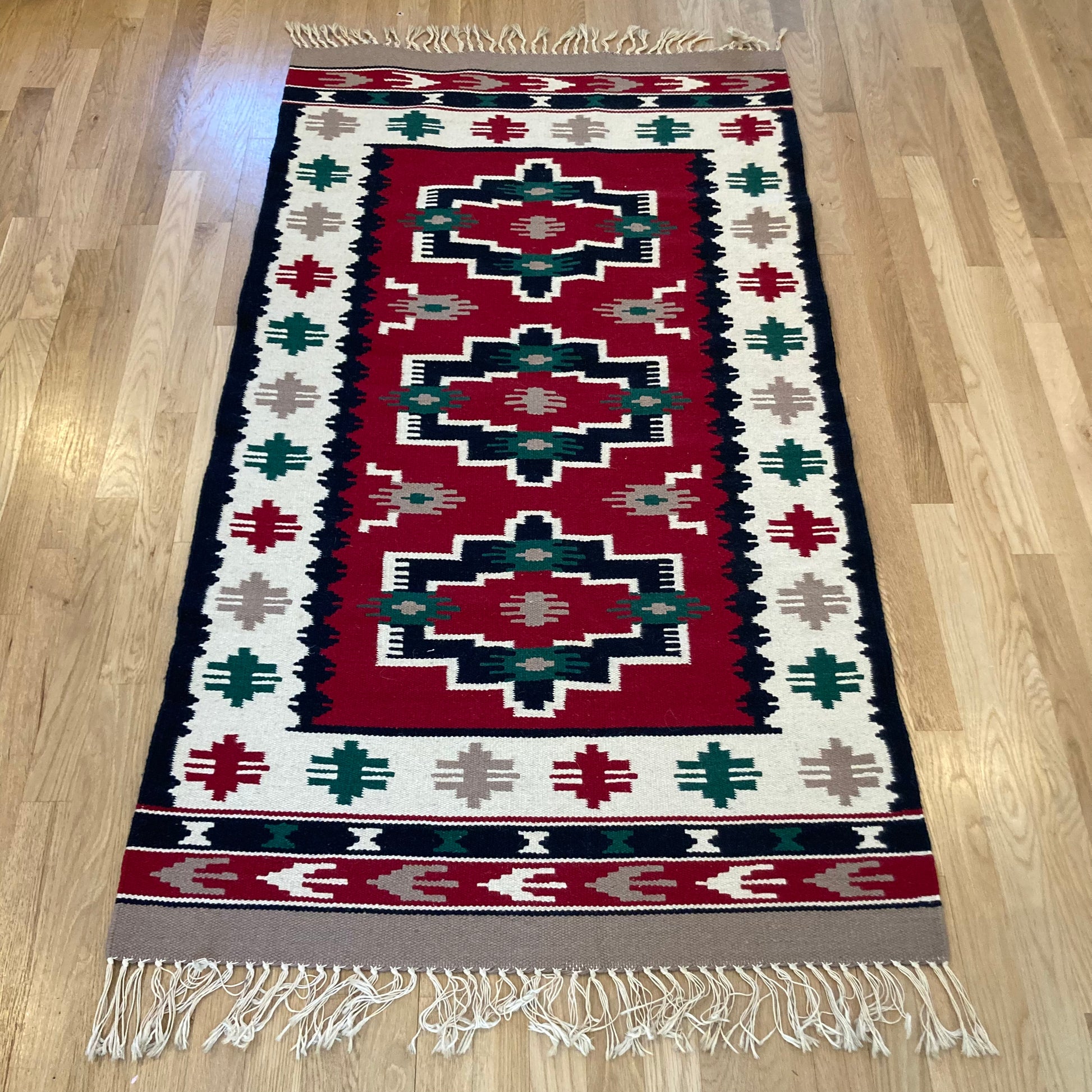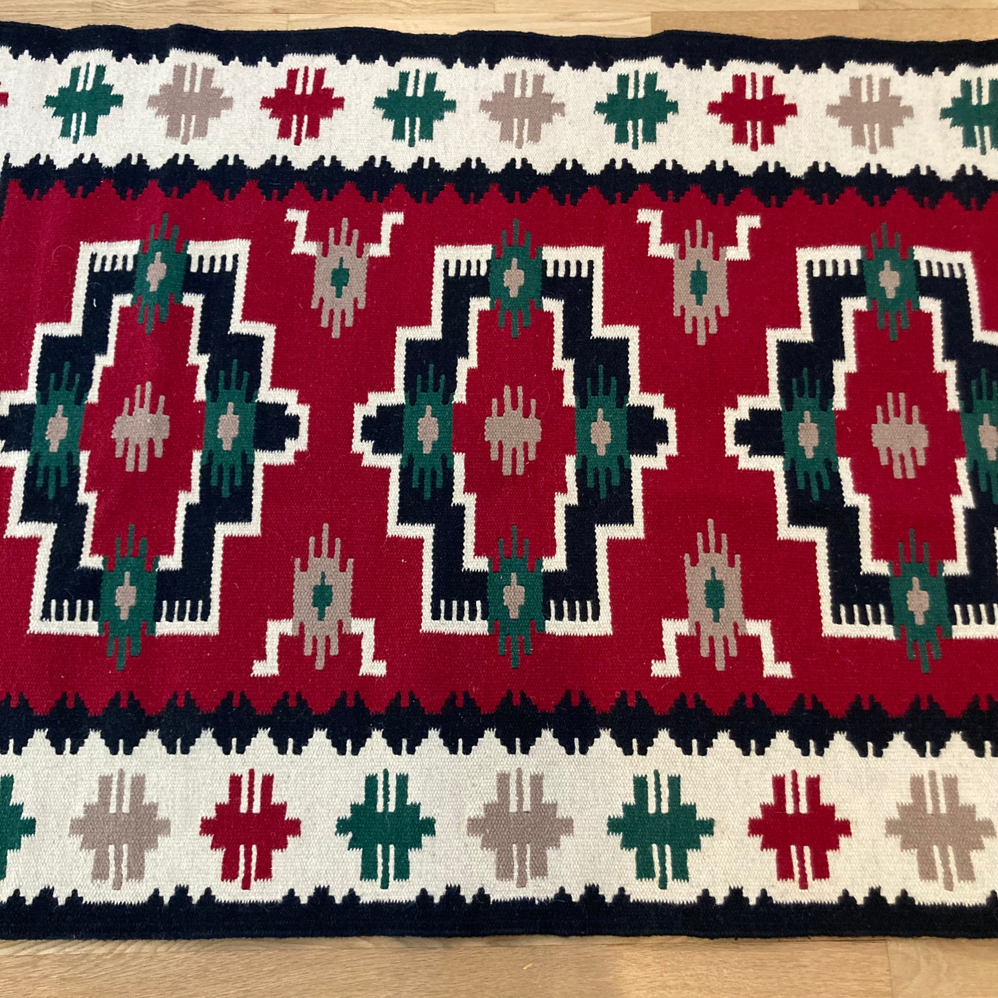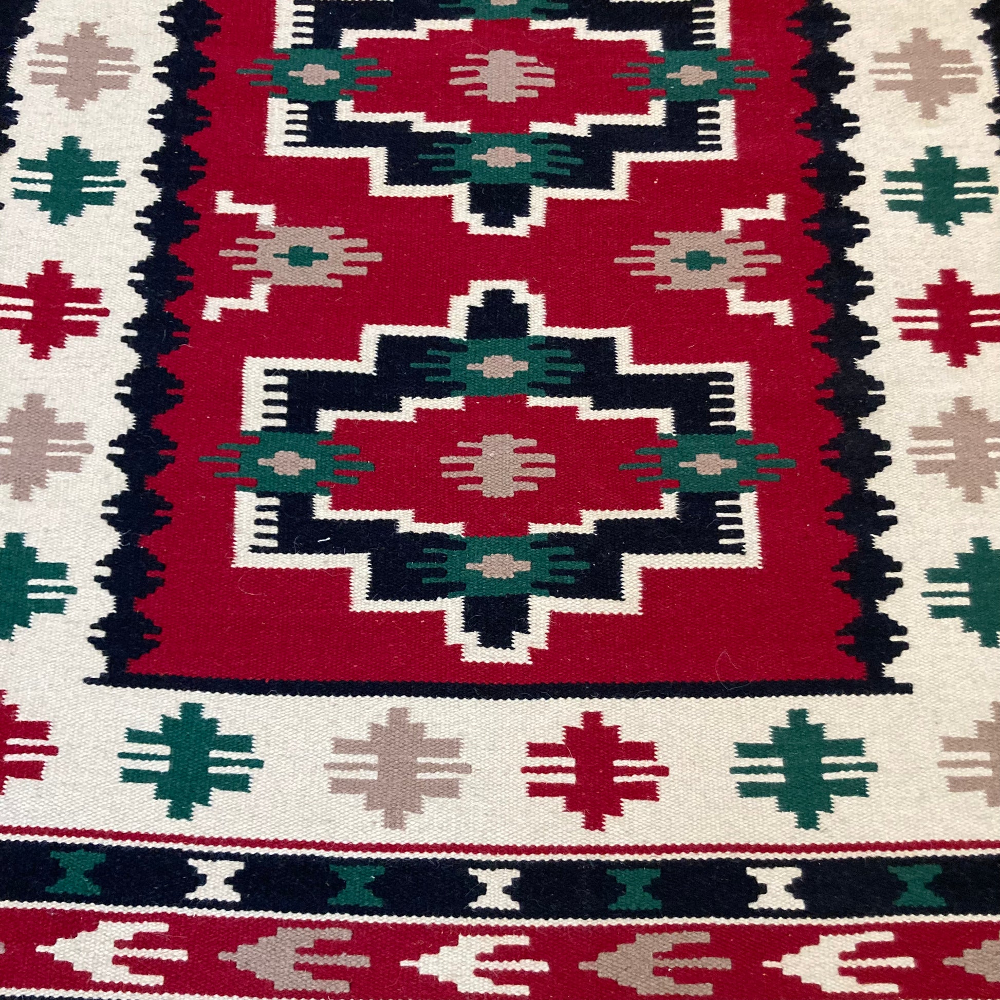 This vintage flatweave is in very good condition. The design features a geometric pattern set in a red field with white, green and black highlights. There is light wear throughout. The measurement includes the fringe.