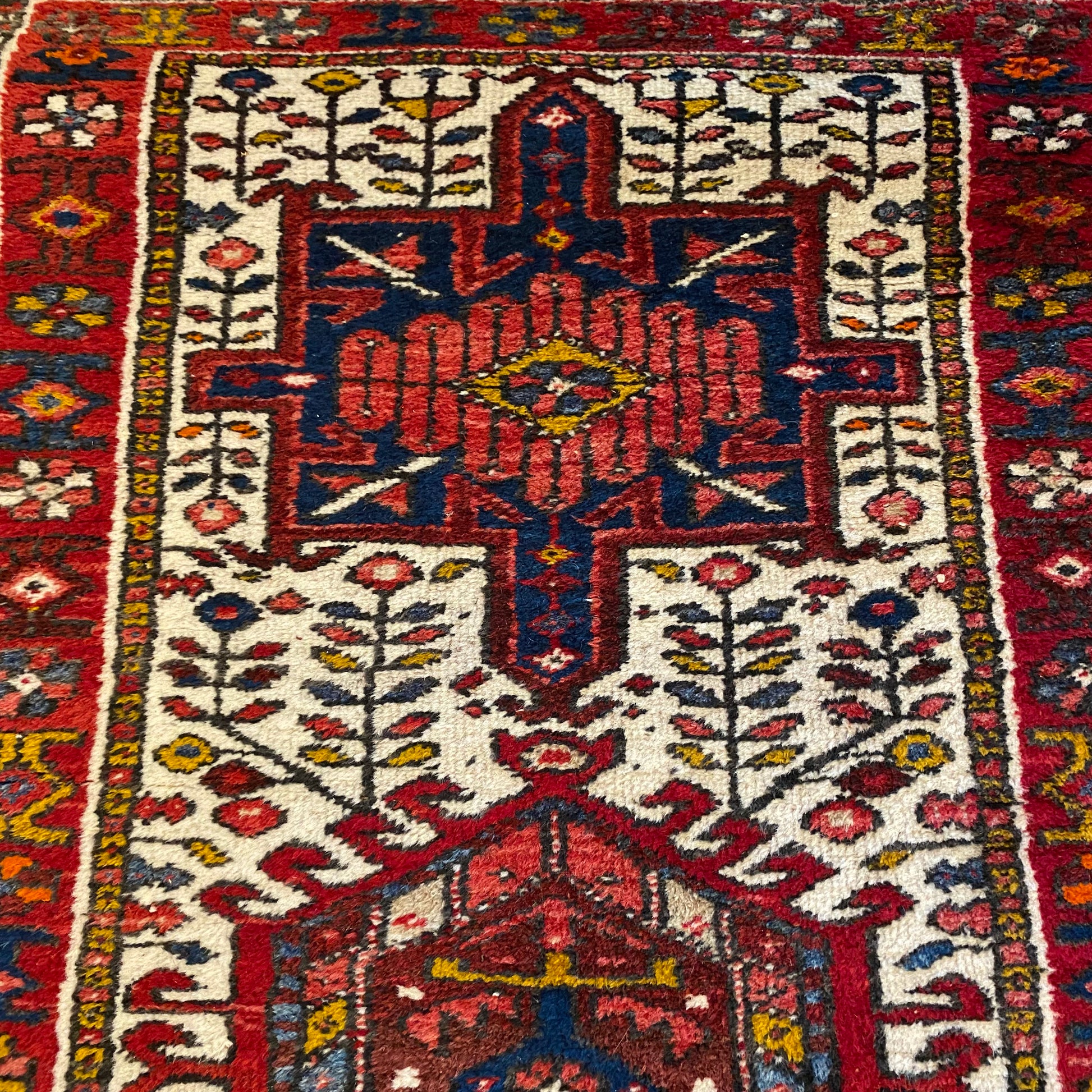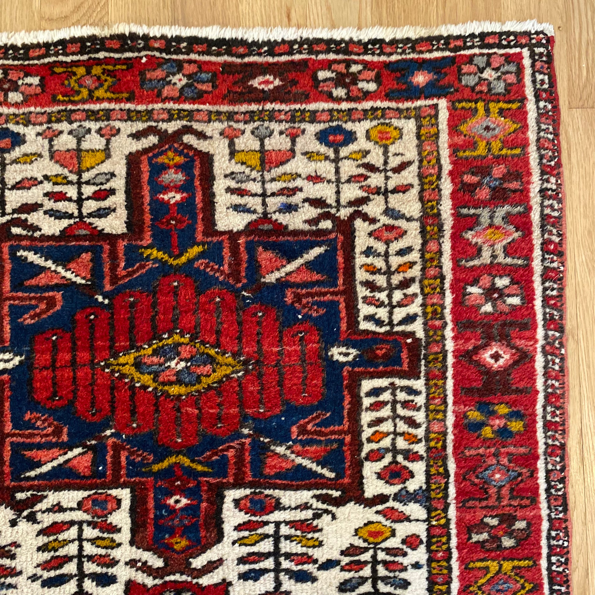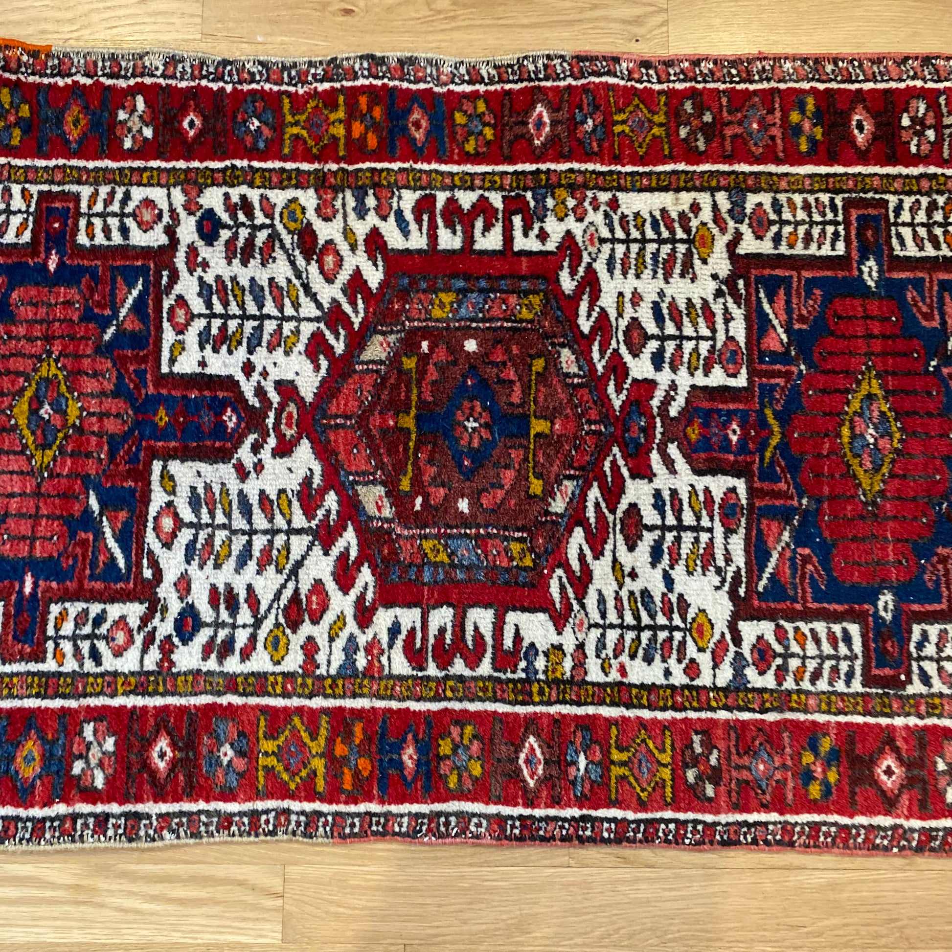 This vintage rug is in very good condition. The design features a tribal pattern set in a white field with red and blue highlights. There is even wear throughout.