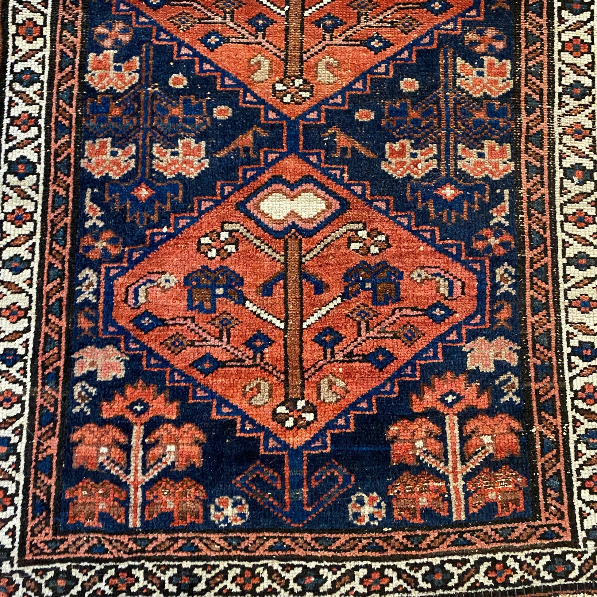 This vintage rug is in very good condition. The design features tribal medallions set in a blue field with white and soft red-orange highlights. There is even wear throughout.