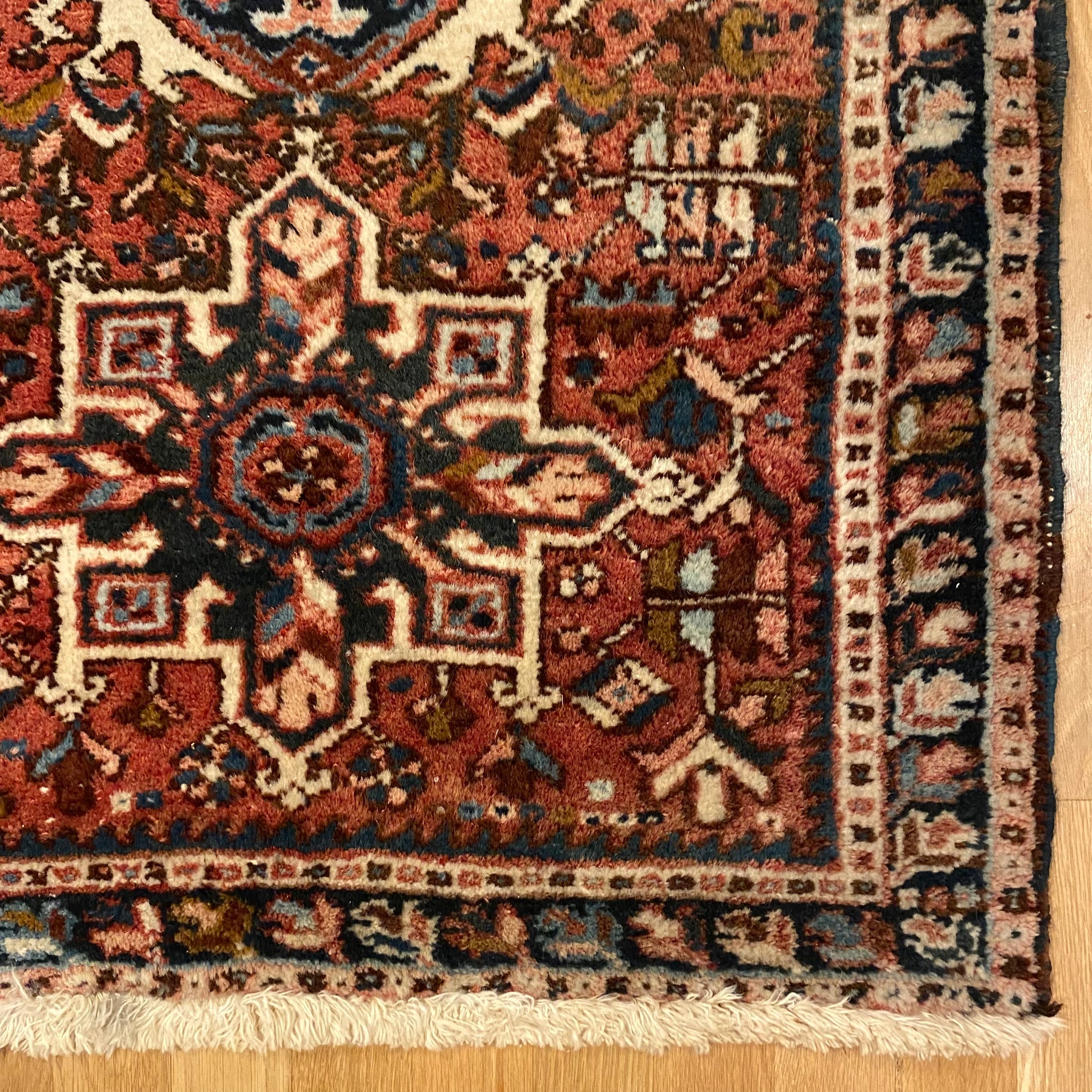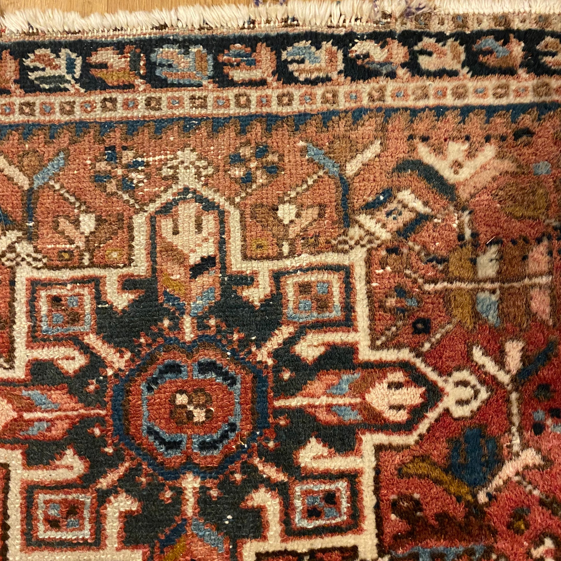 This vintage rug is in very good condition. The design features tribal medallions set in a red filed with blue and white highlights. There is even fading and wear throughout.