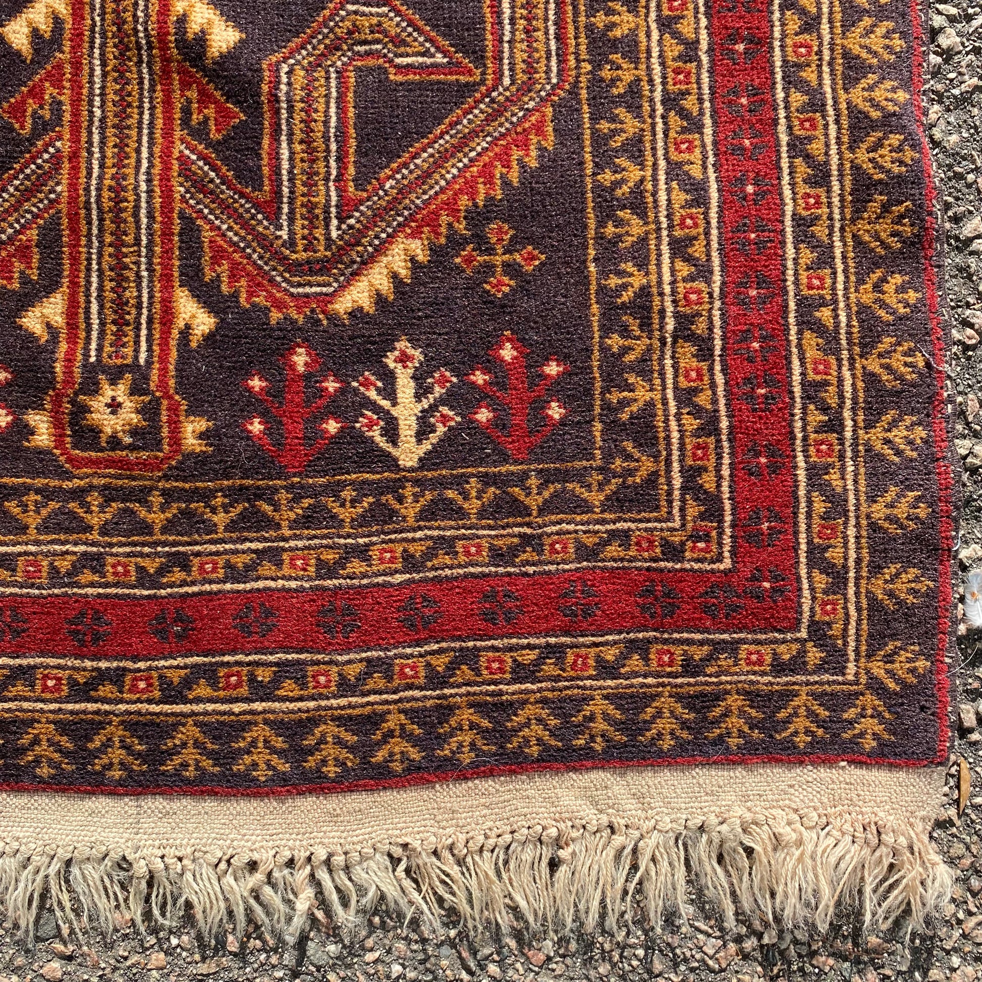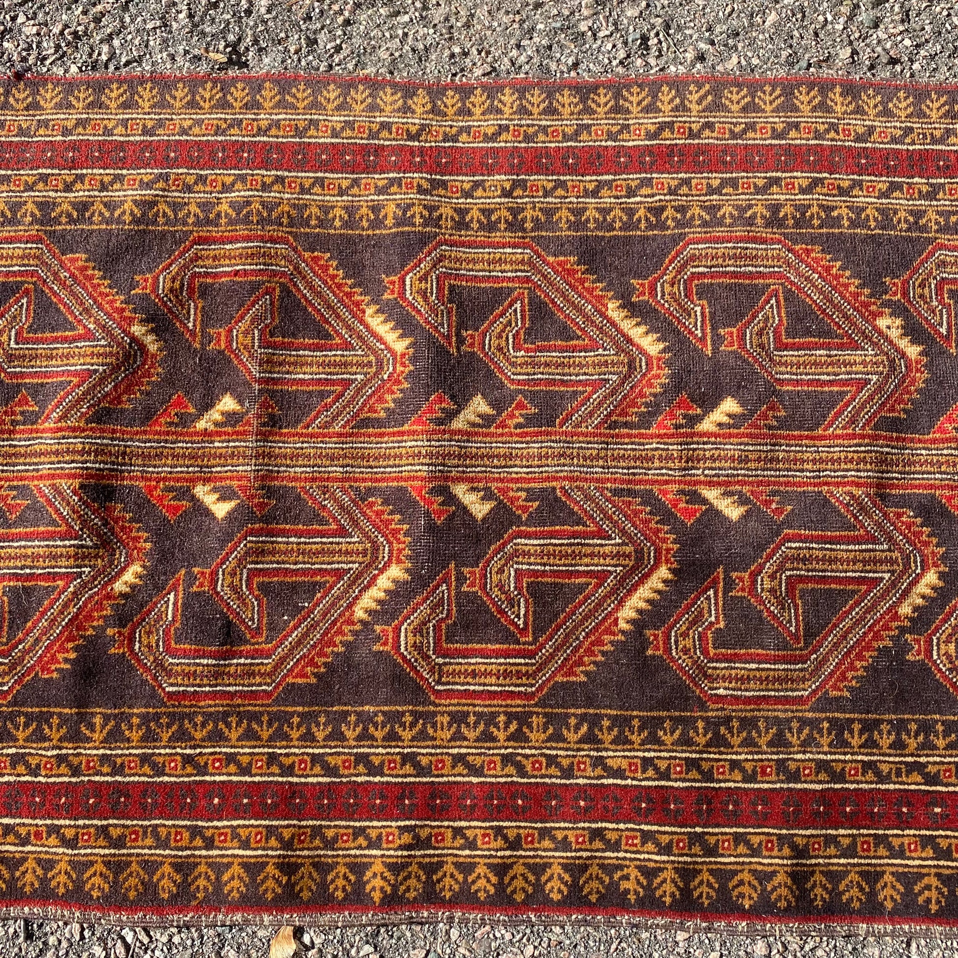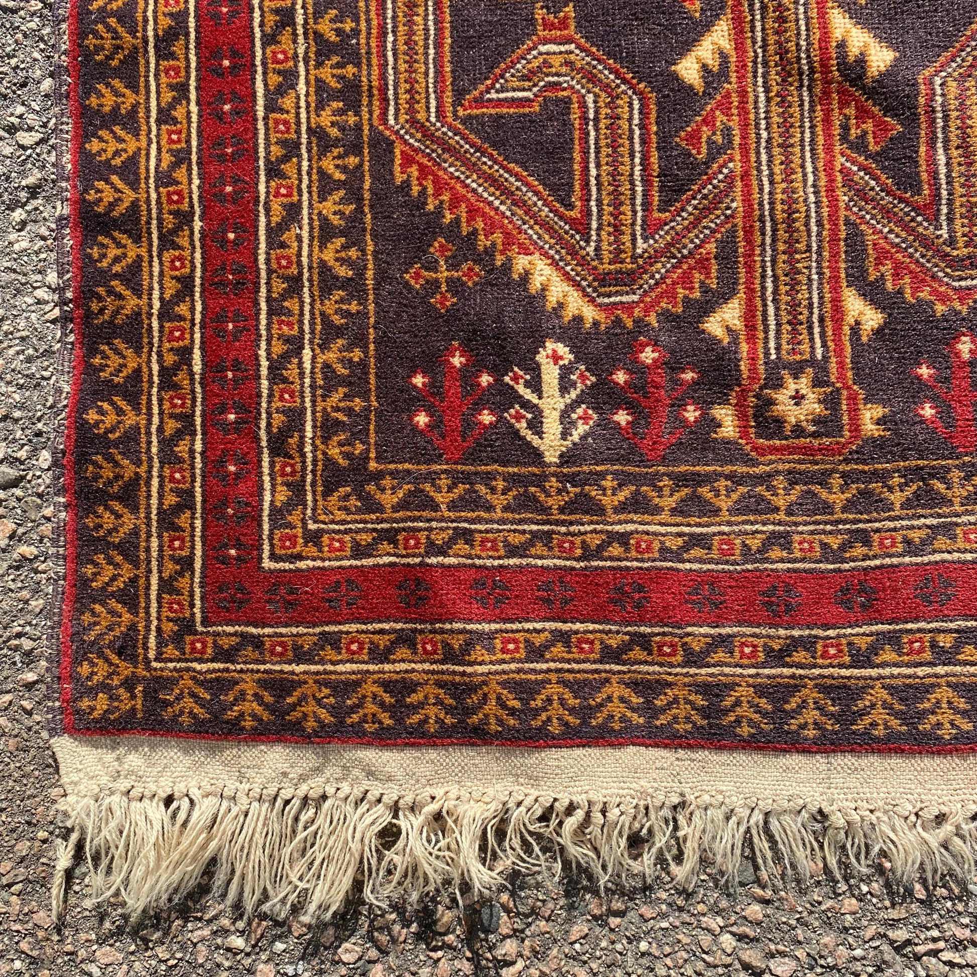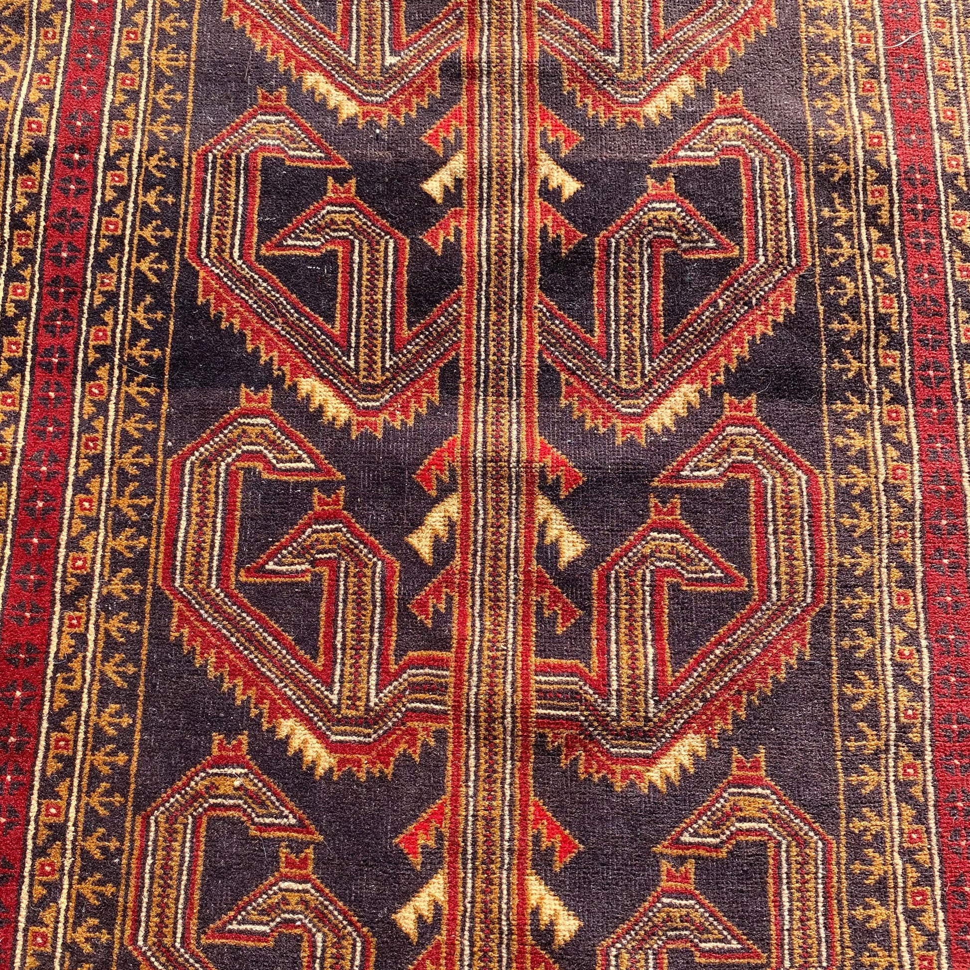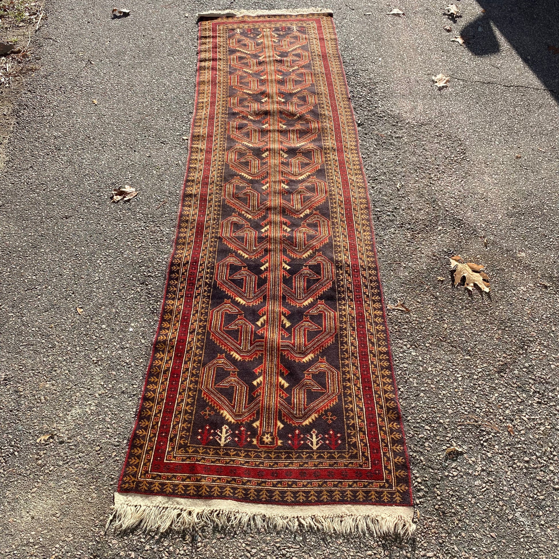 This vintage rug runner is in very good condition. The design features a tribal pattern set in a dark blue-black field with white and red highlights. There is wear throughout and some blemishes on the fringe ends as seen in the photos.