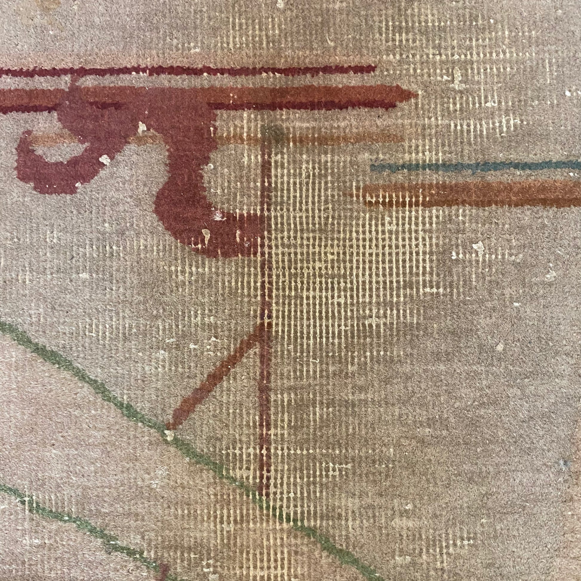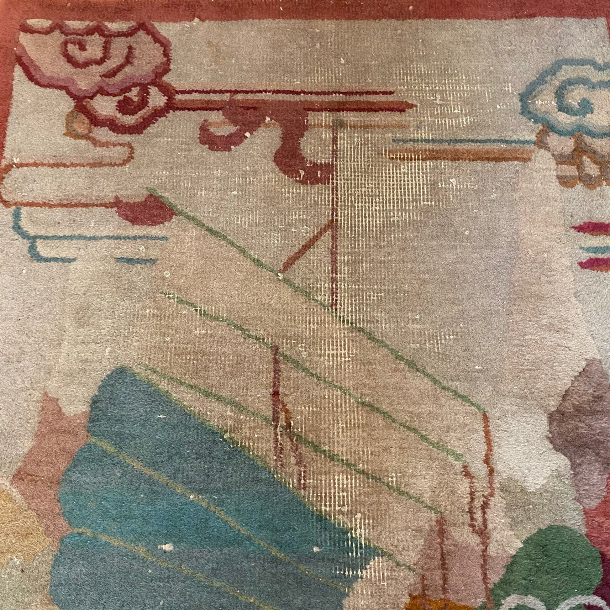 This vintage rug is in good condition. The design features a pictorial scene with a boat sailing on water with clouds and birds. There is wear on the edges, fringe ends and throughout.