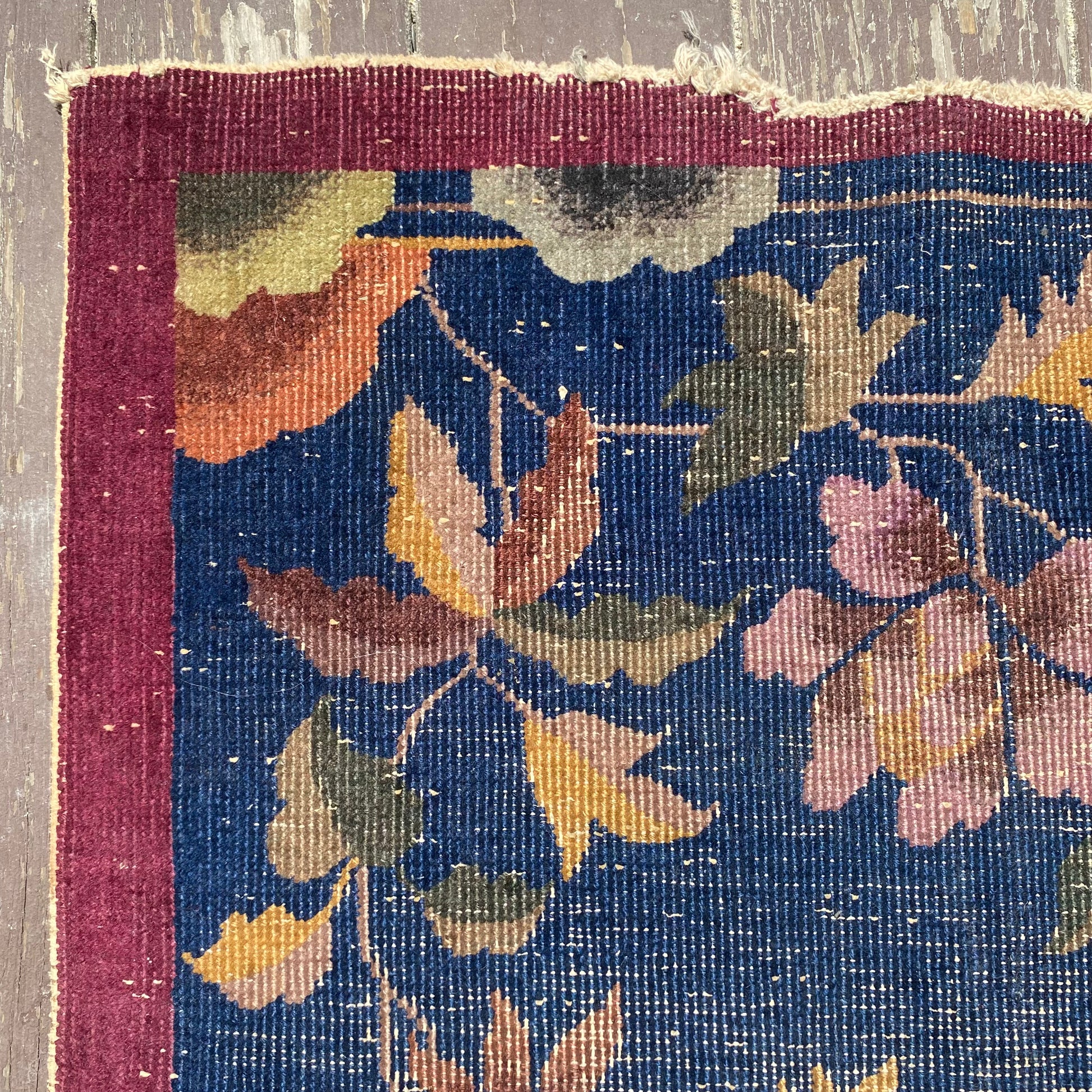This vintage rug is in poor condition. The design features an open blue field with a pavilion and botanical elements. There is heavy wear on the edges, fringe ends and throughout. This rug has been shortened as seen in the photos.