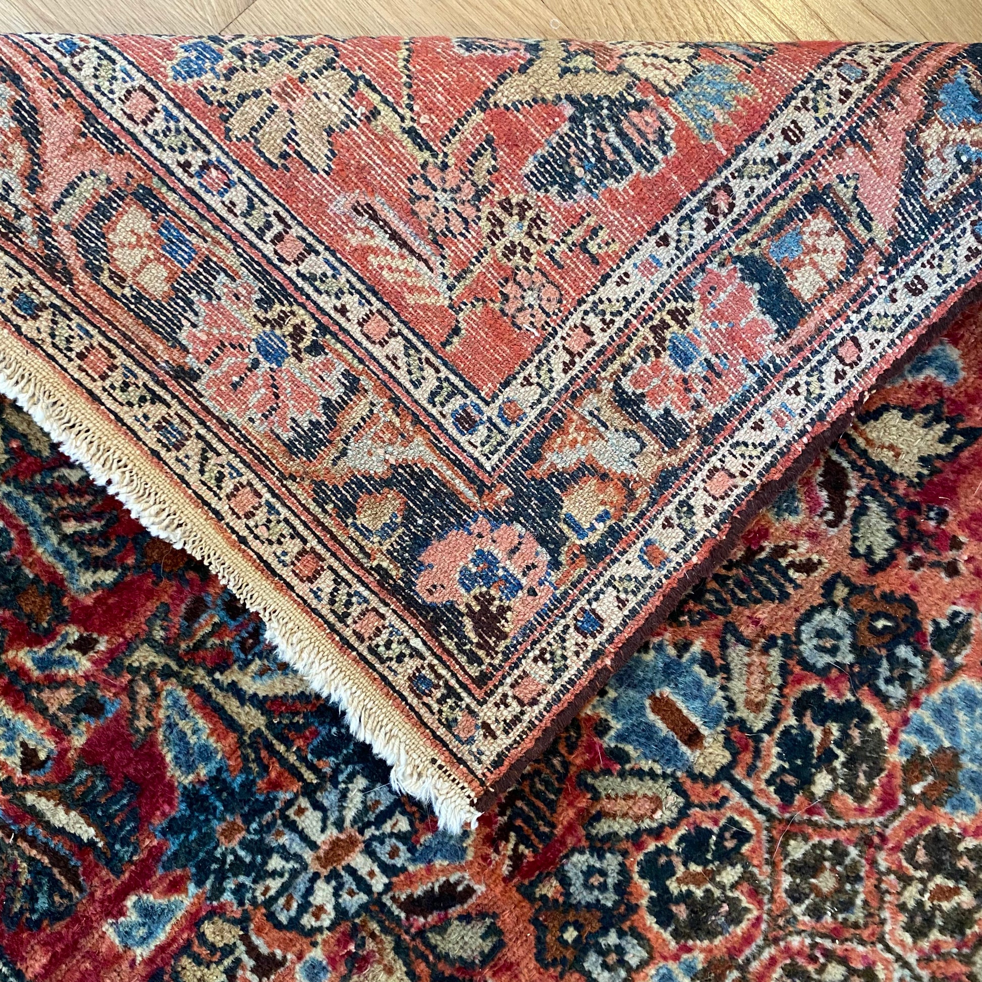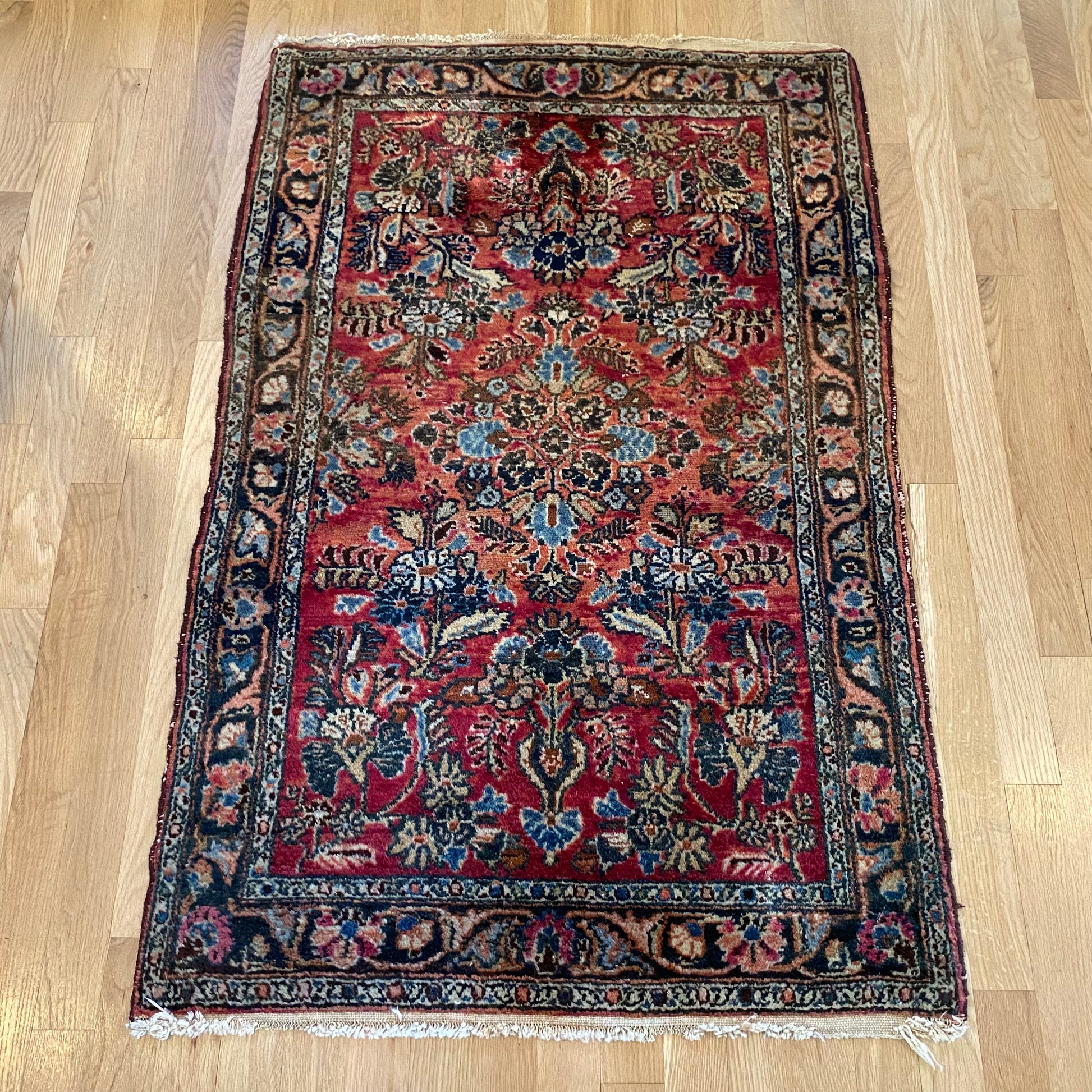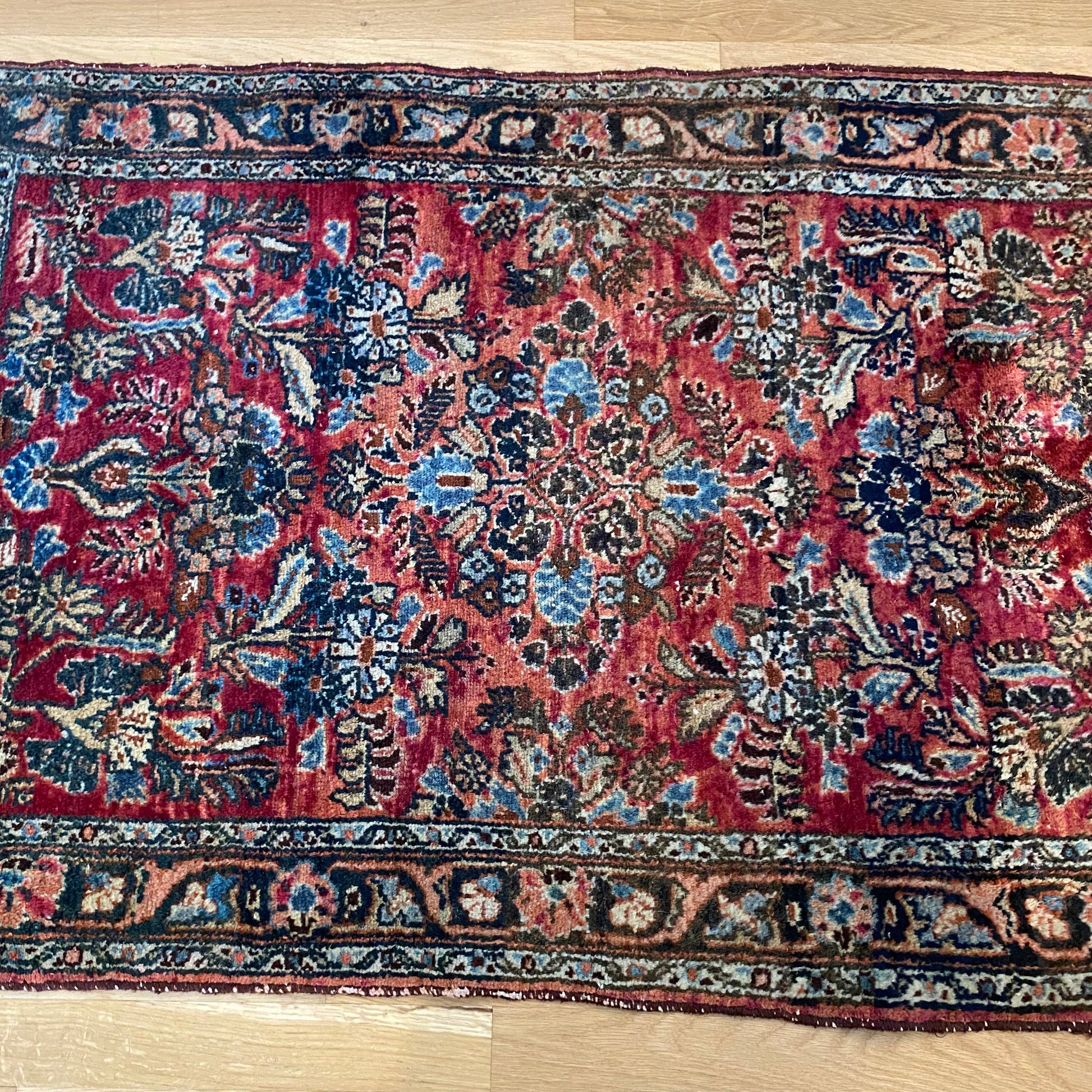This vintage rug is in poor condition. The design features an all-over floral pattern set in a dark pink field with blue and brown highlights. There is wear on the edges, fringe ends and throughout. There is an area of white paint residue as seen in the photos.