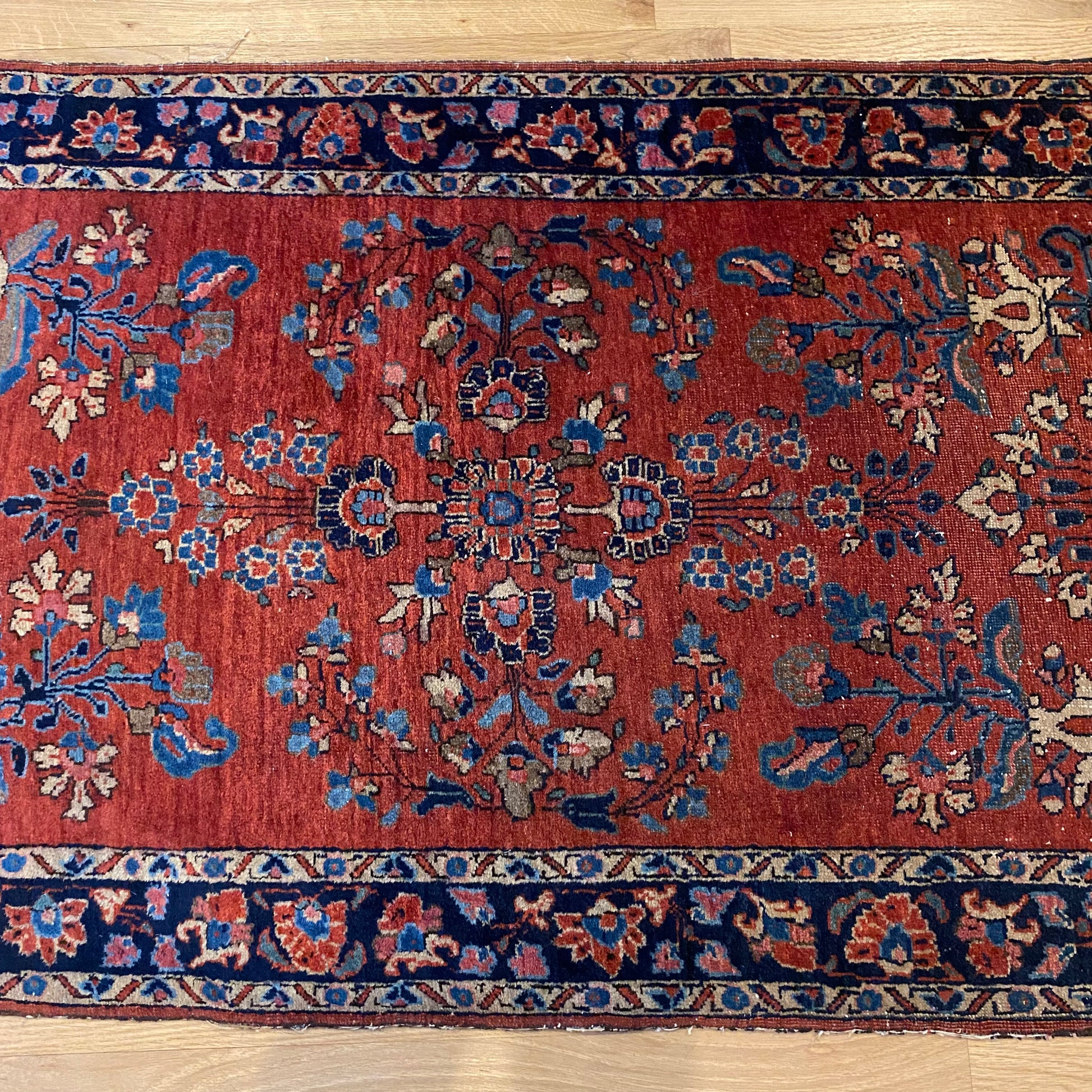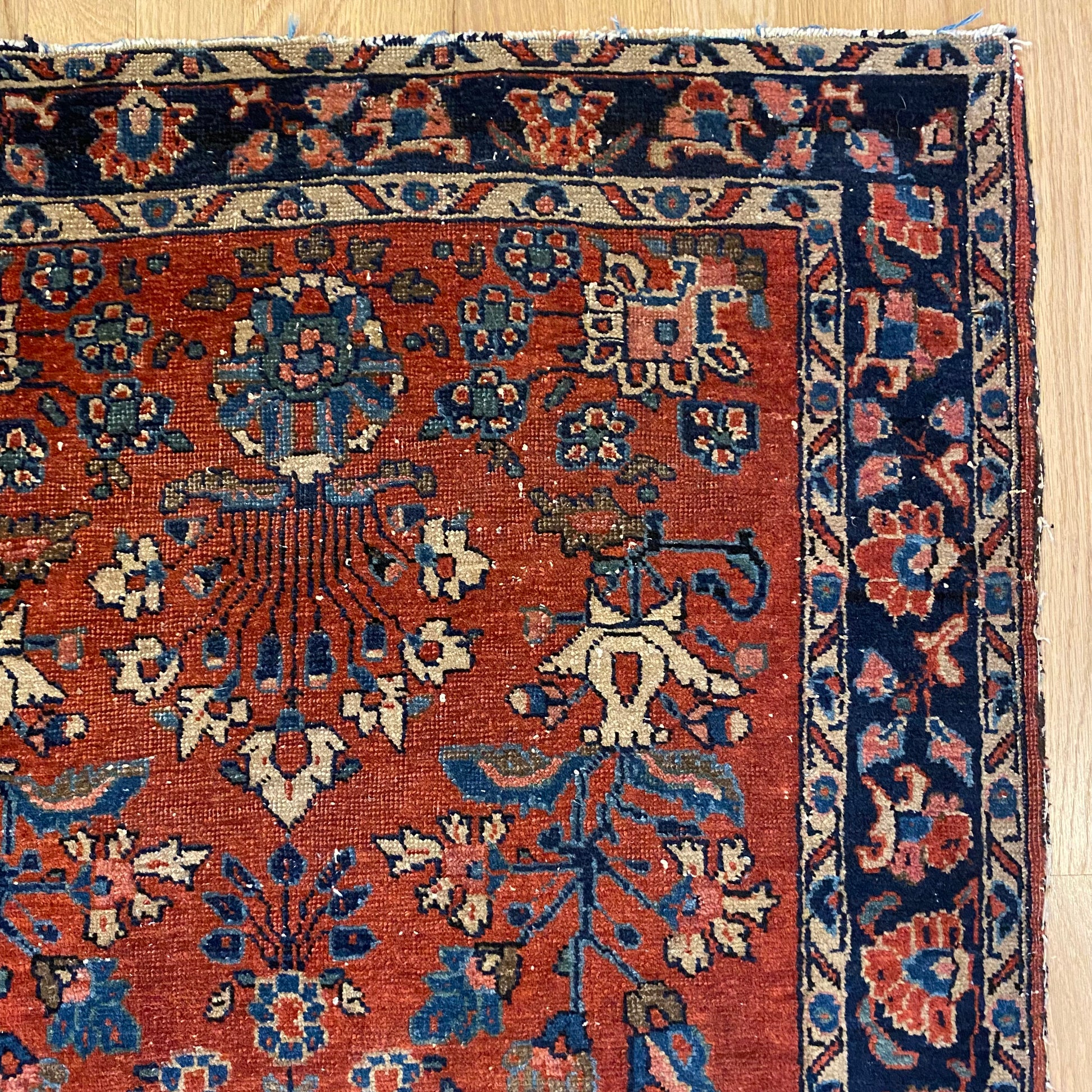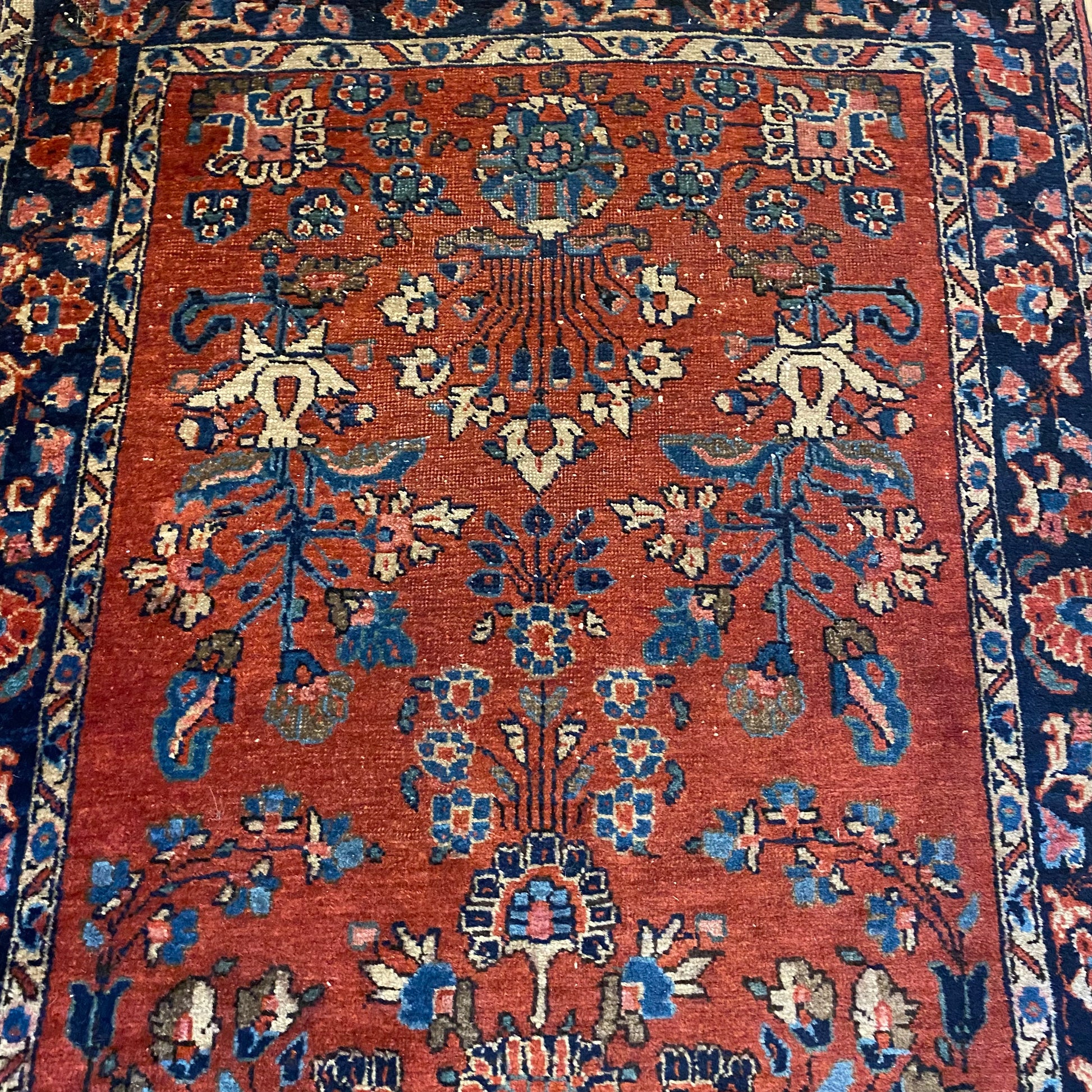 This semi antique rug is in very good condition. The design features an all-over floral pattern set in a dark pink-orange field with blue and cream highlights. There is wear on the edges and fringe ends. There is even wear throughout.