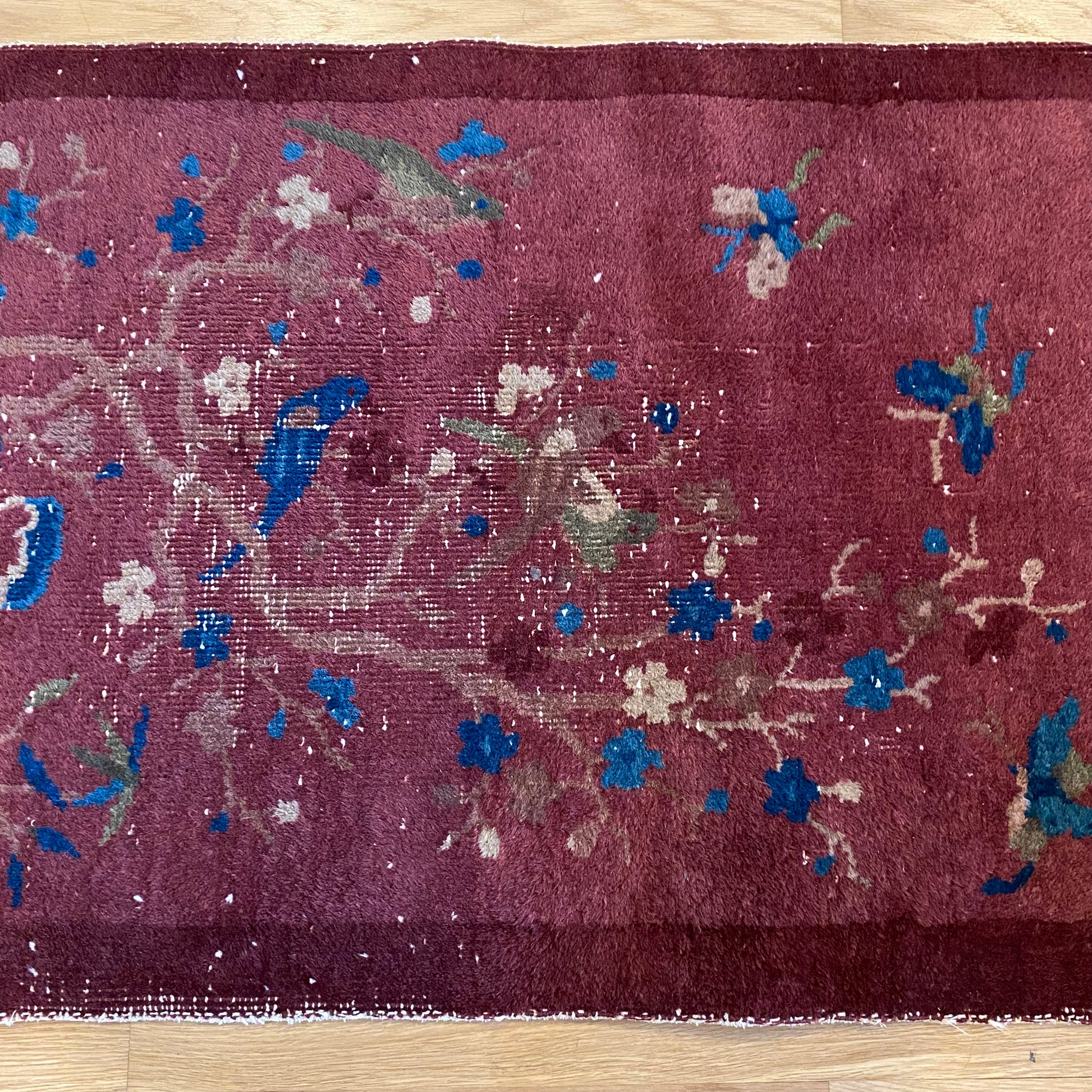 This vintage rug is in good condition. The design features botanical and butterfly motifs set in a magenta field with blue and tan highlights. There is wear on the edges, fringe ends and throughout.