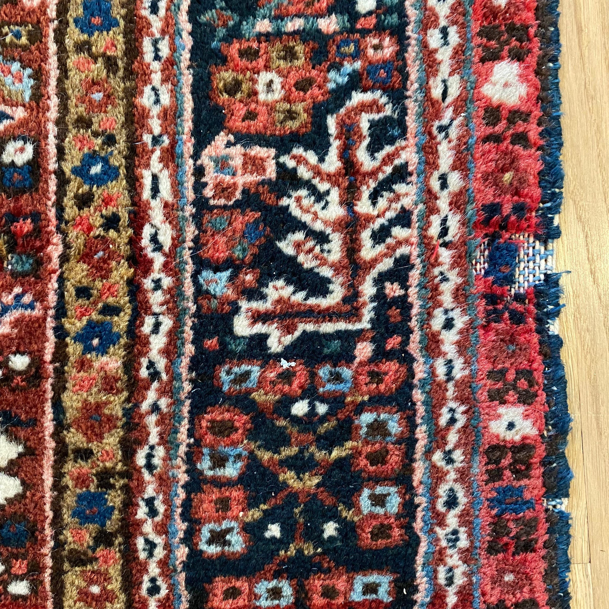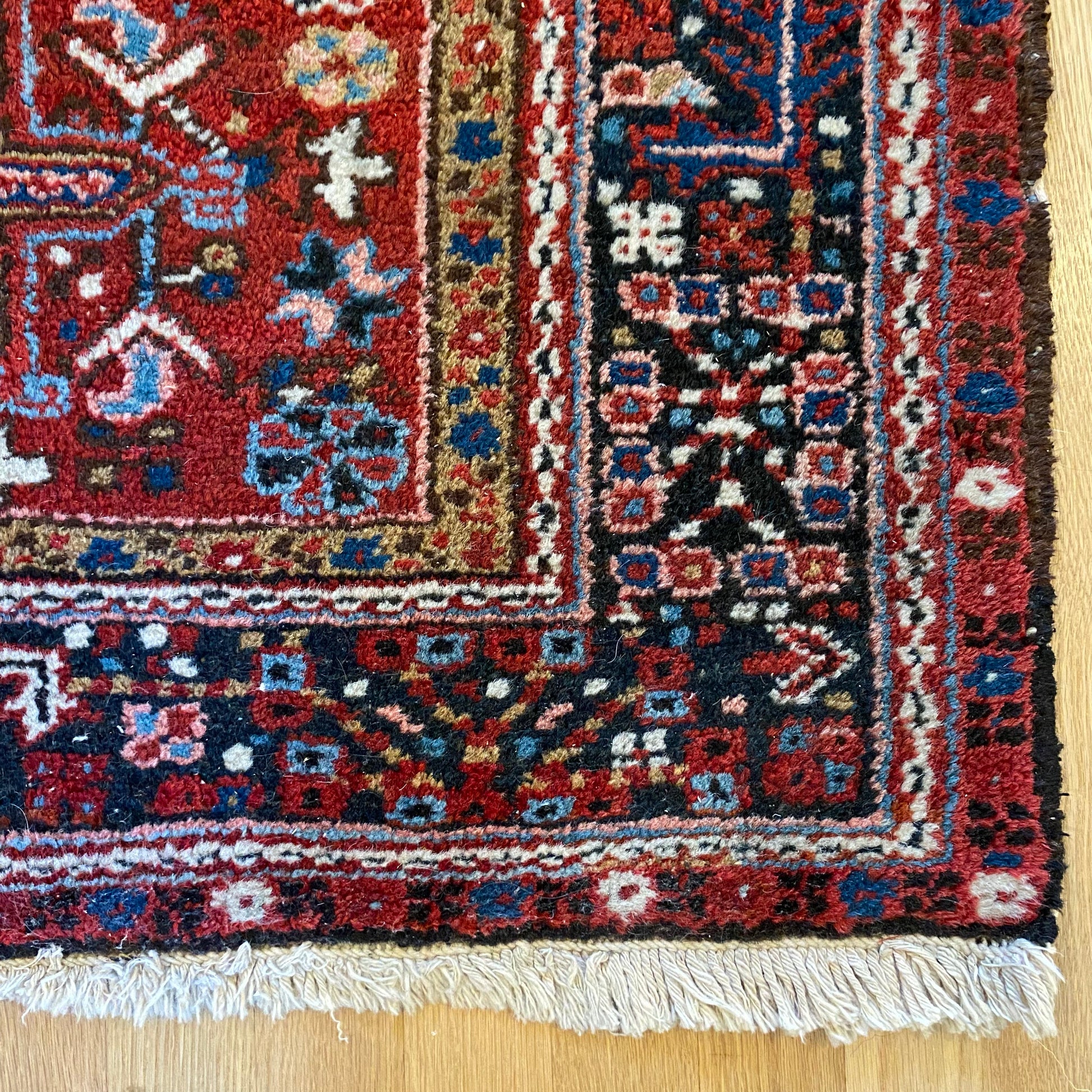 This vintage rug is in fair condition. The design features tribal medallions set in a red field with blue and white highlights. There is wear on the edges, fringe ends and throughout. There is moth damage to the wool pile as seen in the photos.