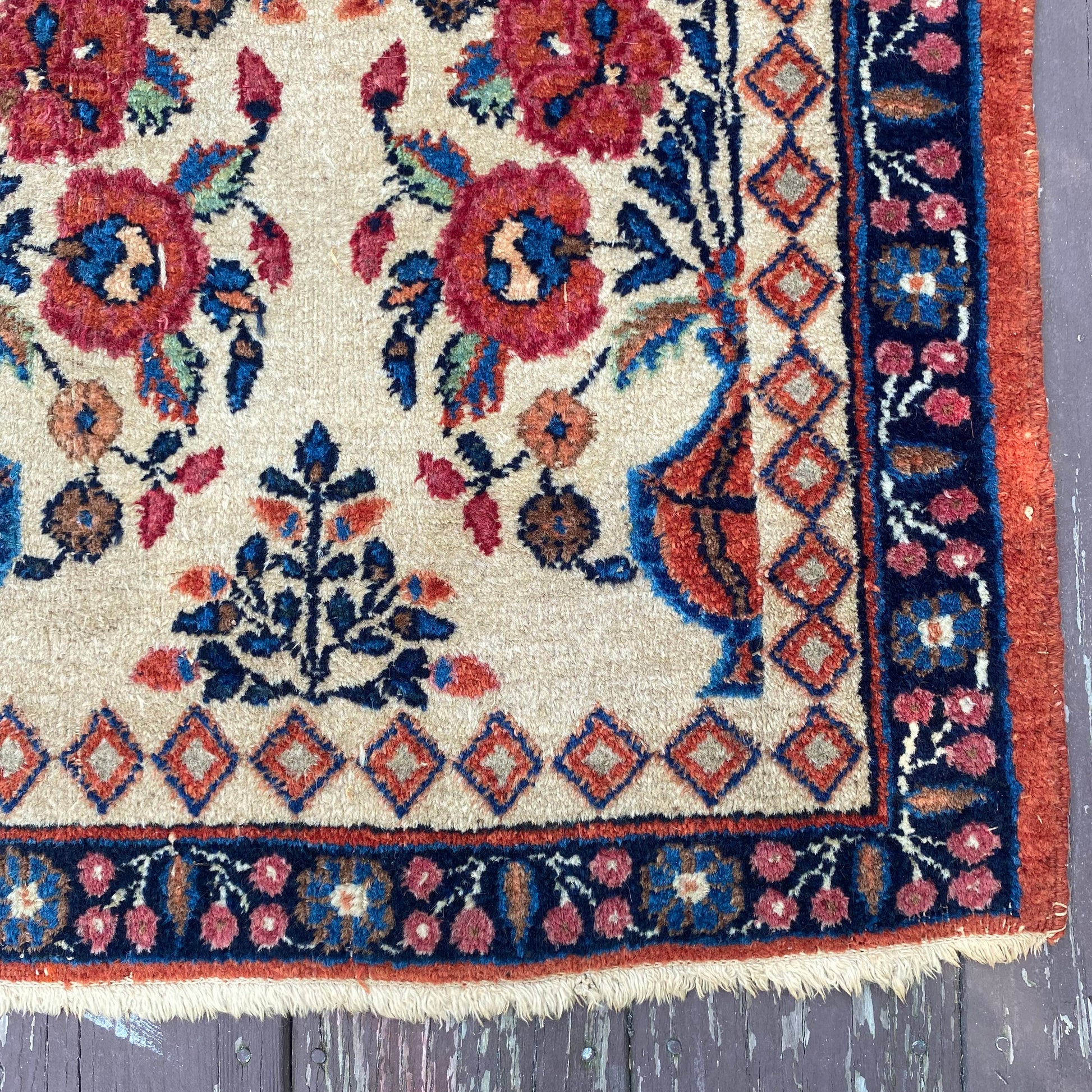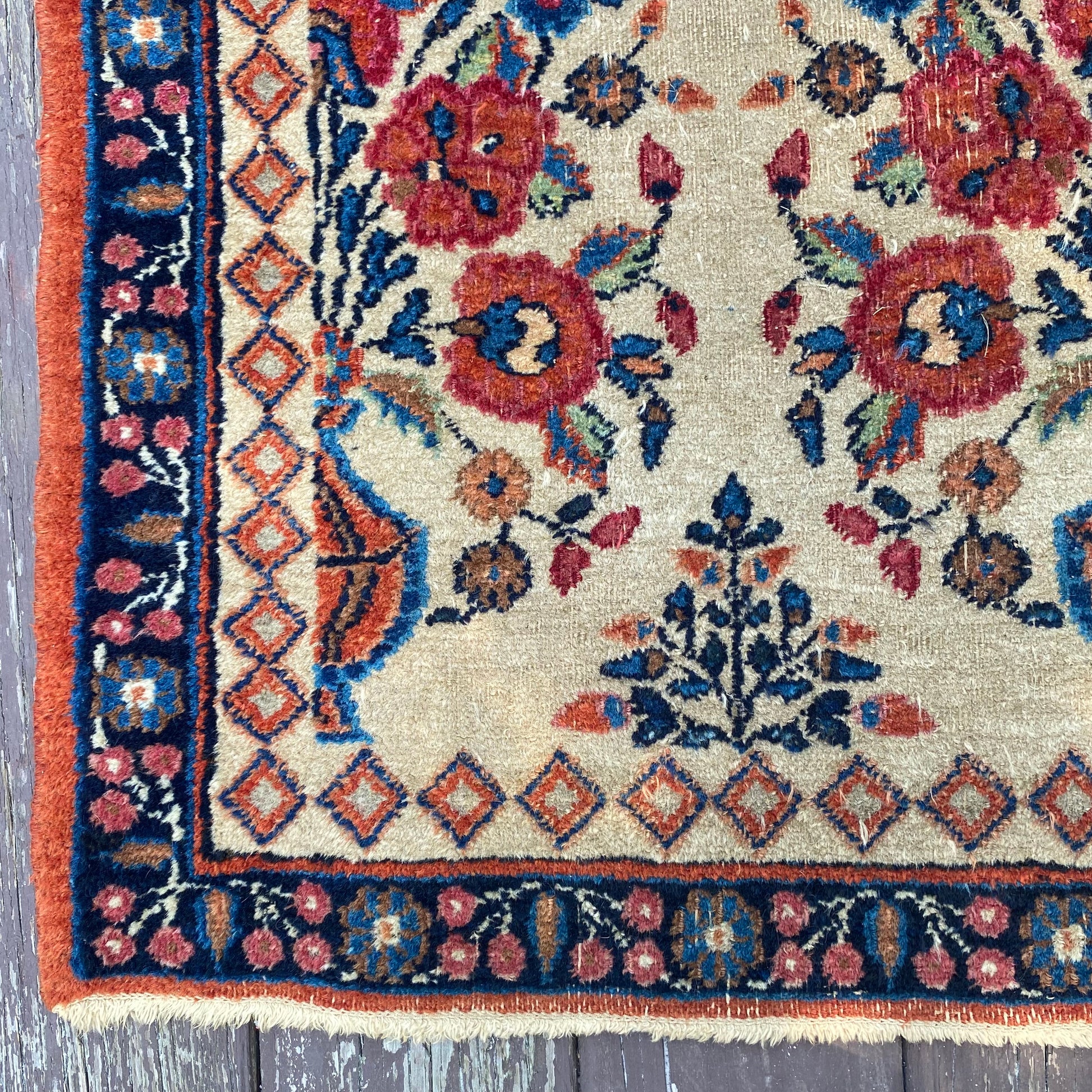 This vintage rug is in very good condition. The design features a floral pattern set in a beige field with dark blue and red-orange highlights. There is wear on the edges, fringe ends and throughout.