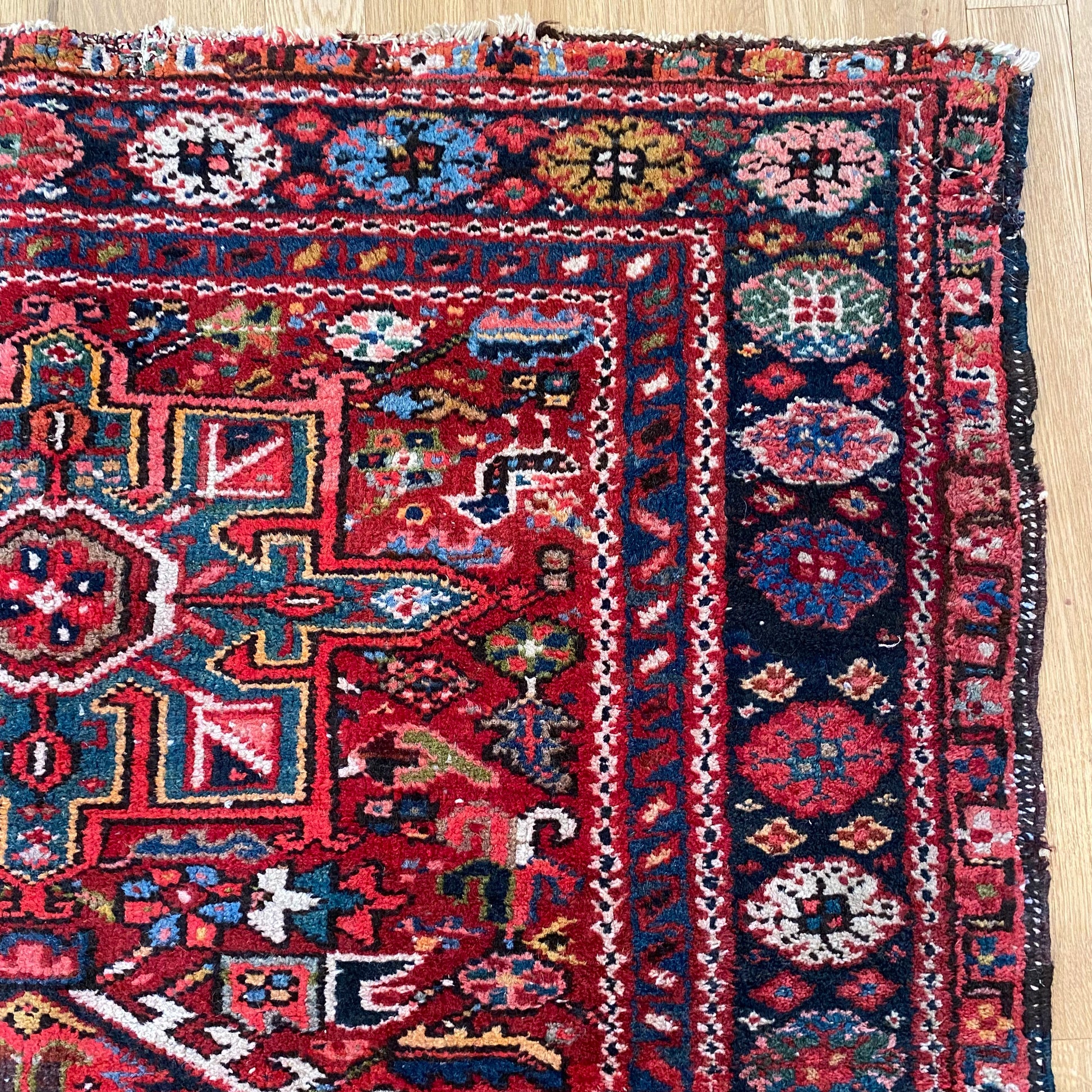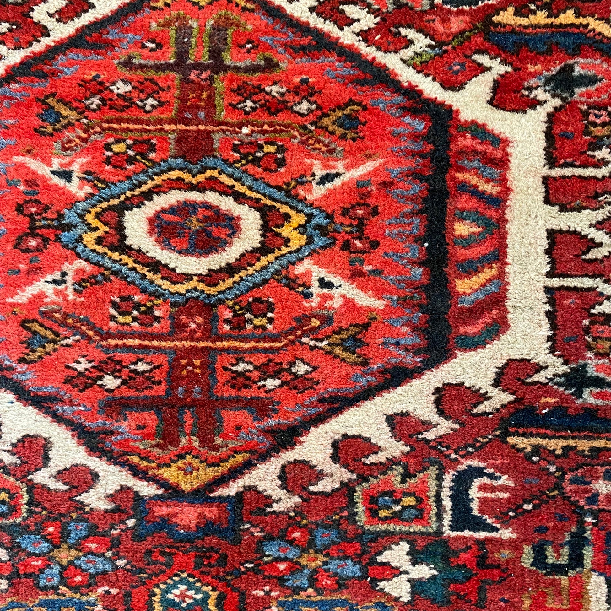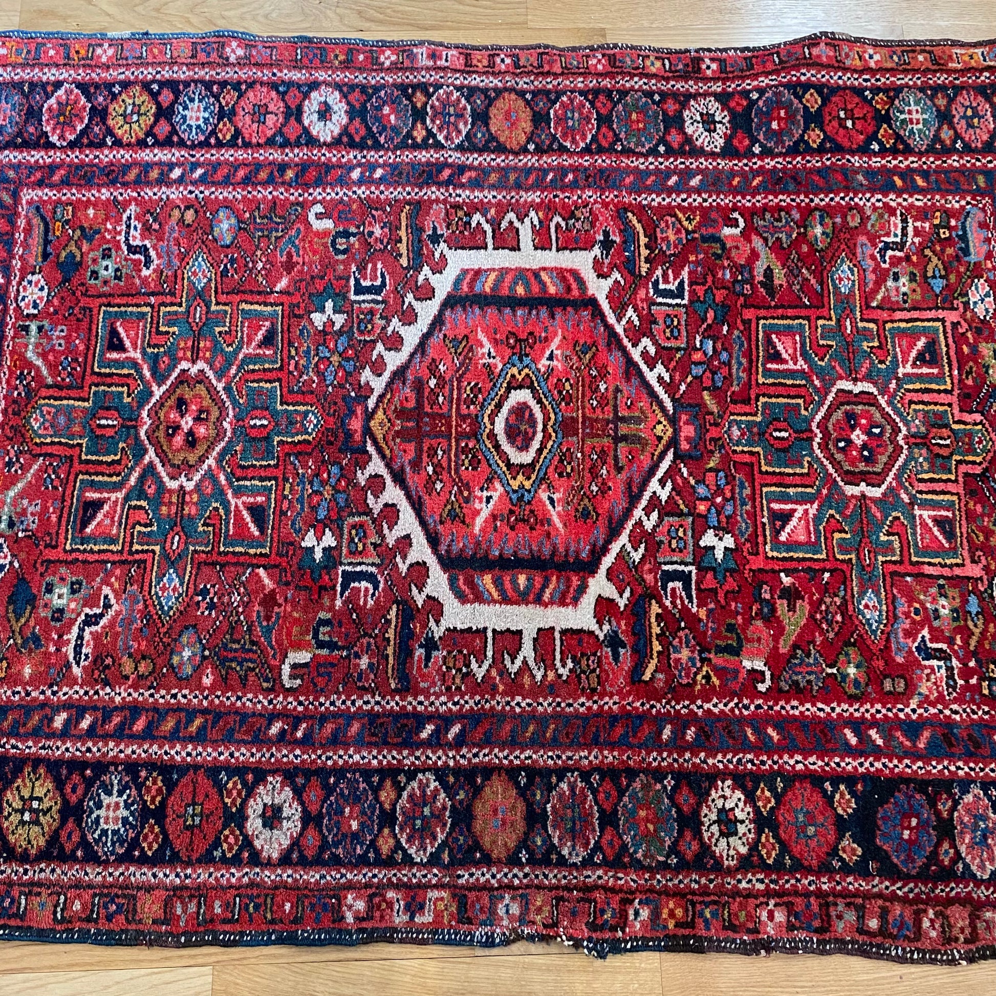 This vintage rug is in very good condition. The design features tribal medallions set in a red field with blue and white highlights. There is light wear throughout.