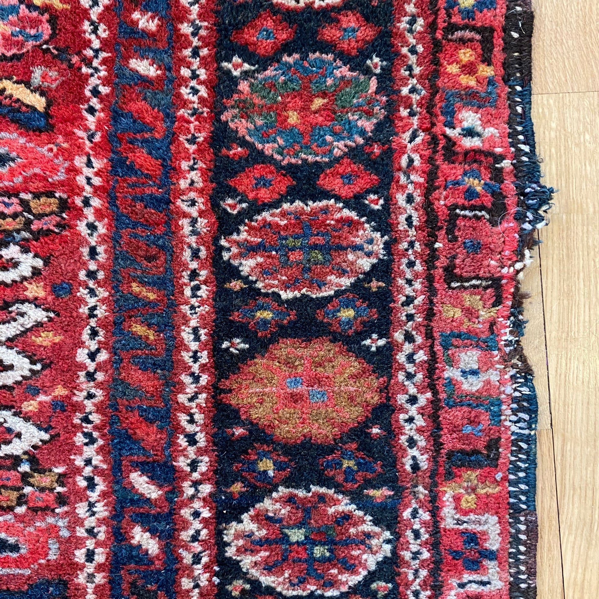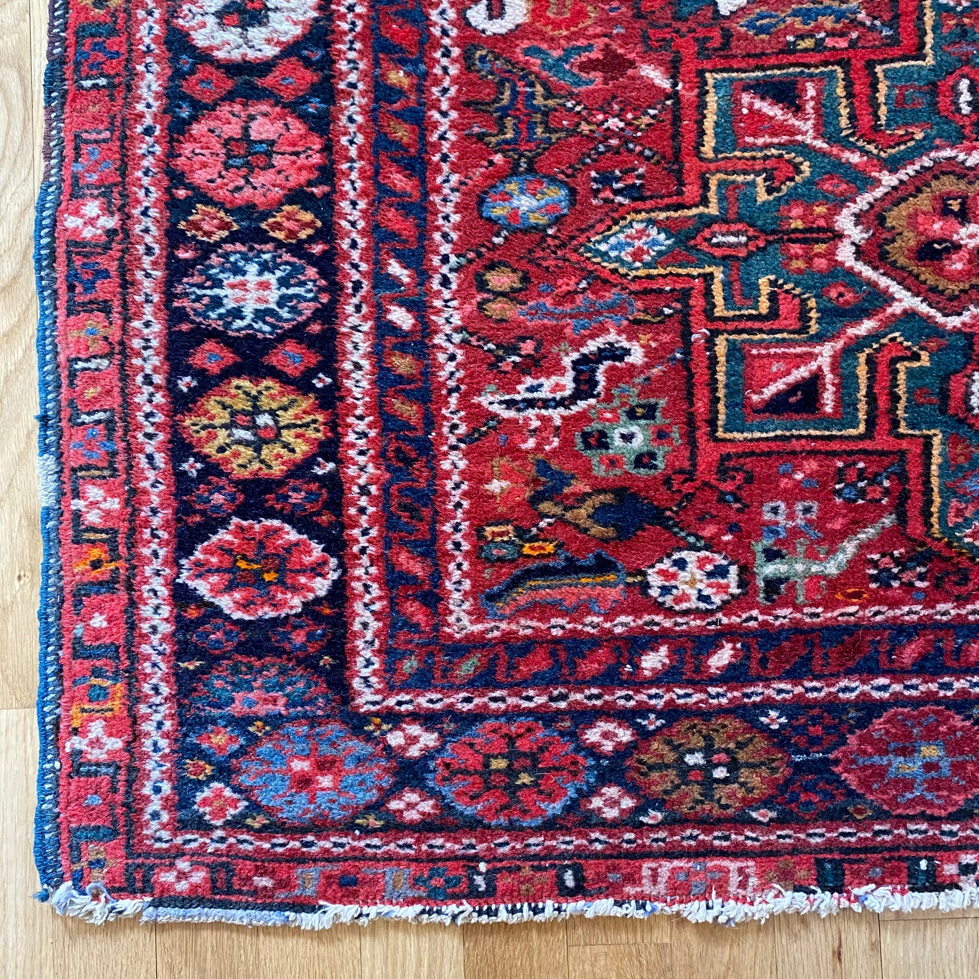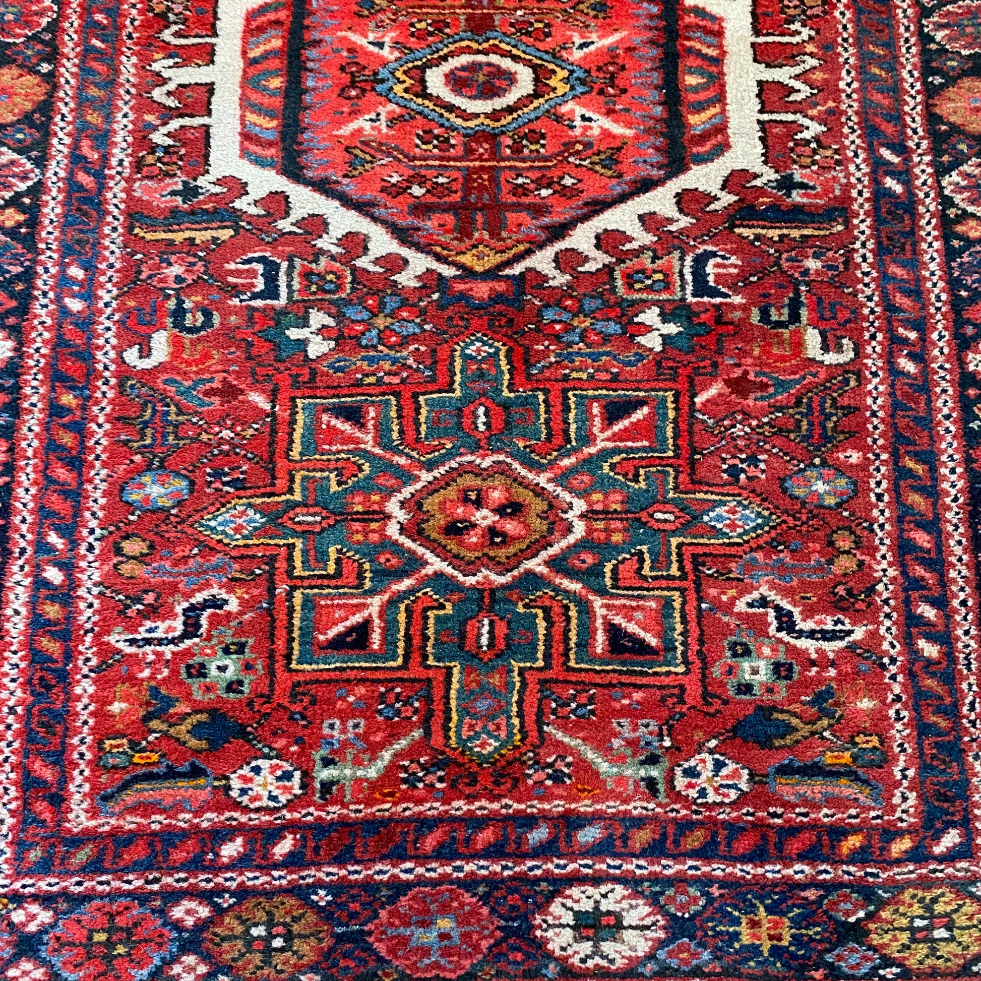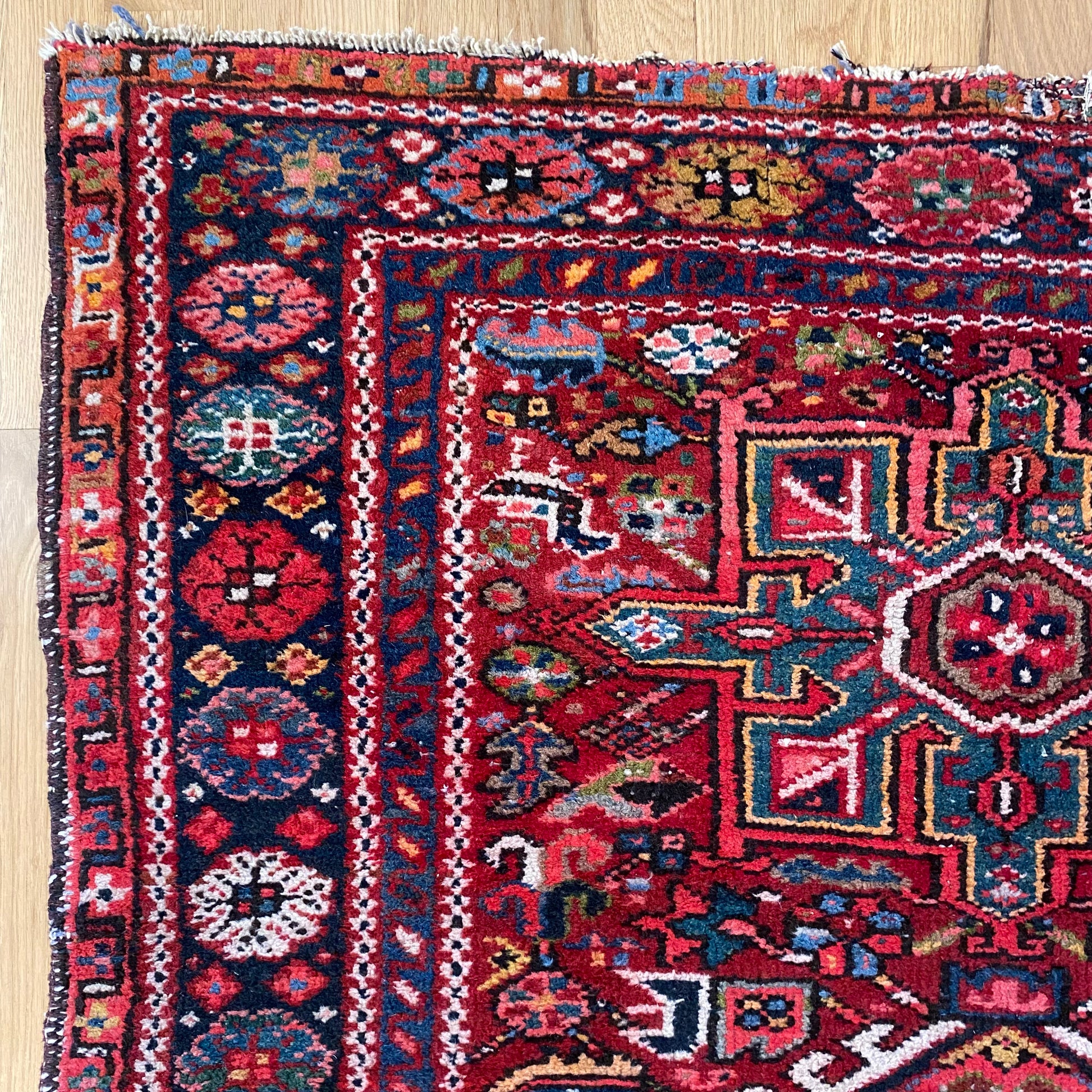 This vintage rug is in very good condition. The design features tribal medallions set in a red field with blue and white highlights. There is light wear throughout.