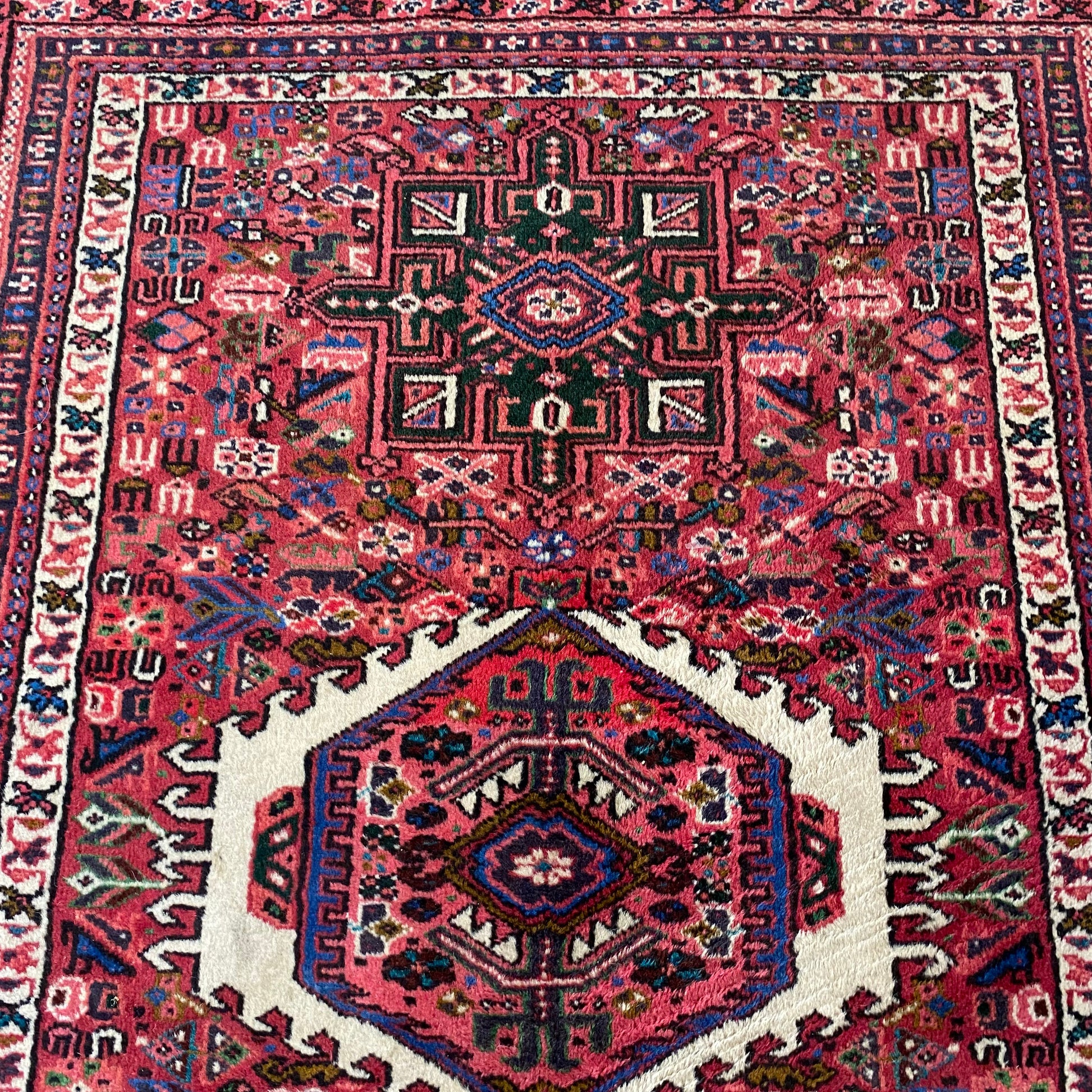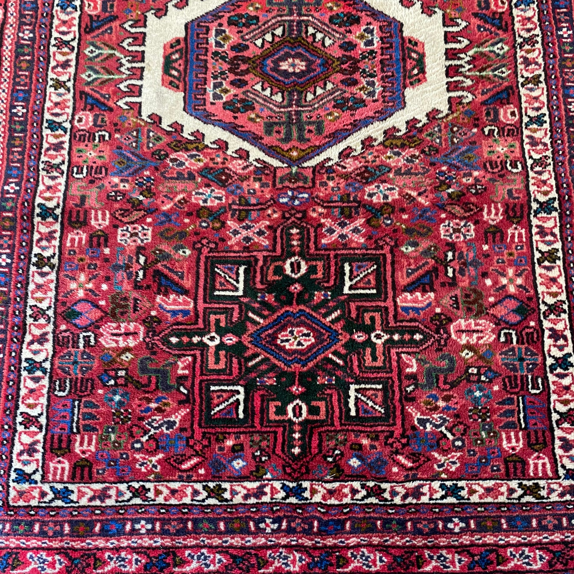 This vintage rug is in very good condition. The design features tribal medallions set in a red field with blue and white highlights. There is light wear throughout.