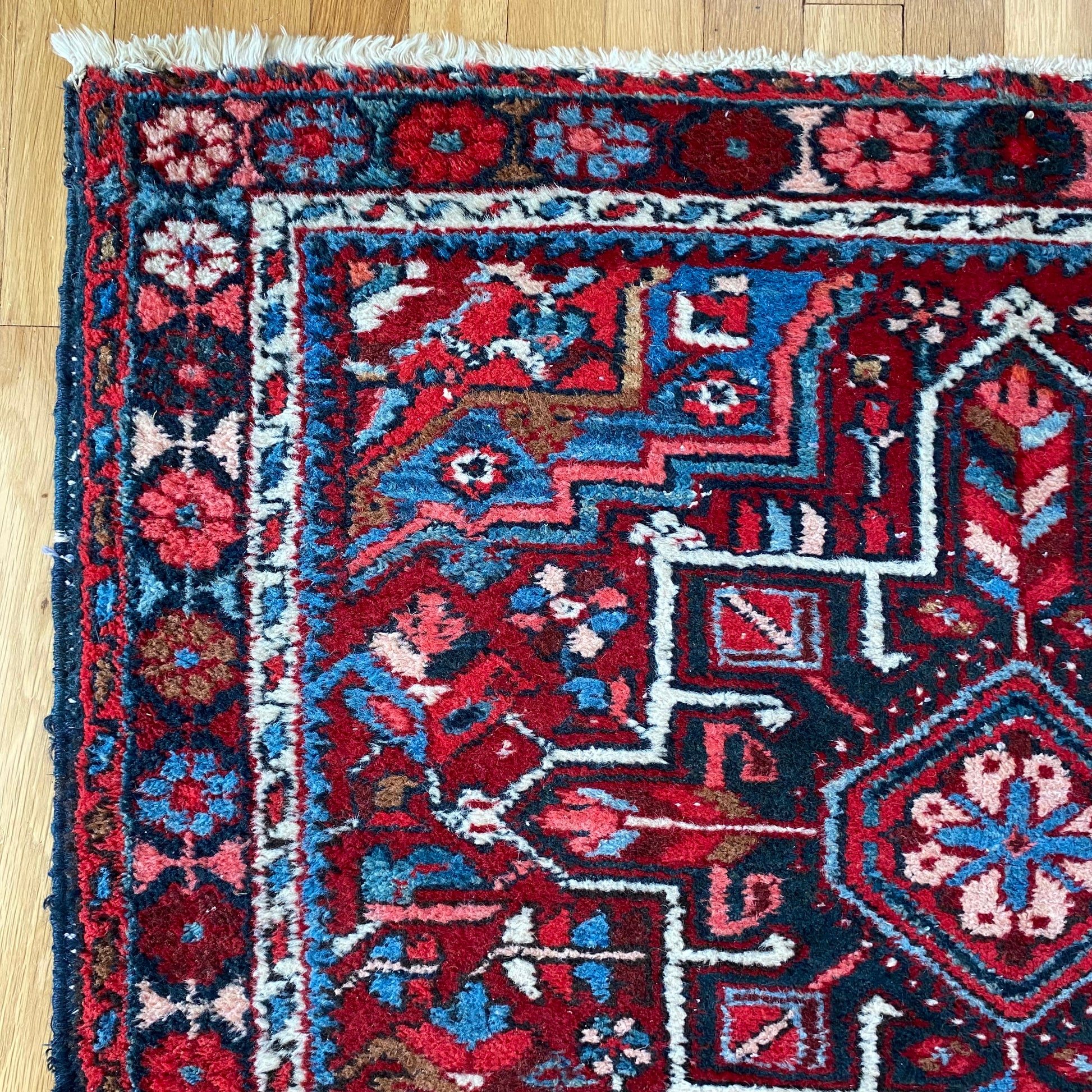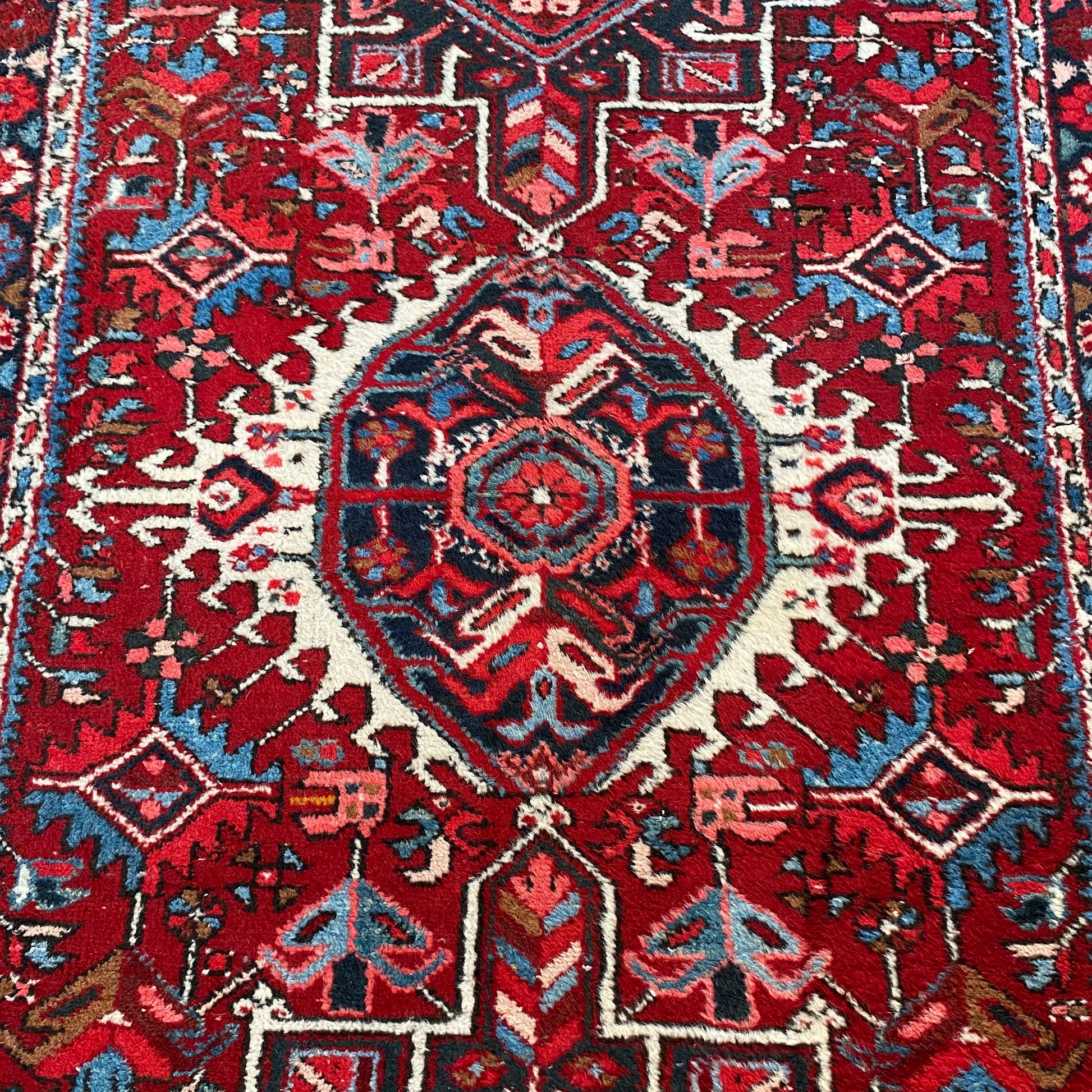 This vintage rug is in very good condition. The design features tribal medallions set in a red field with white and blue highlights. There is wear on the edges, fringe ends and throughout. This rug is hand knotted and is not a perfect rectangle.