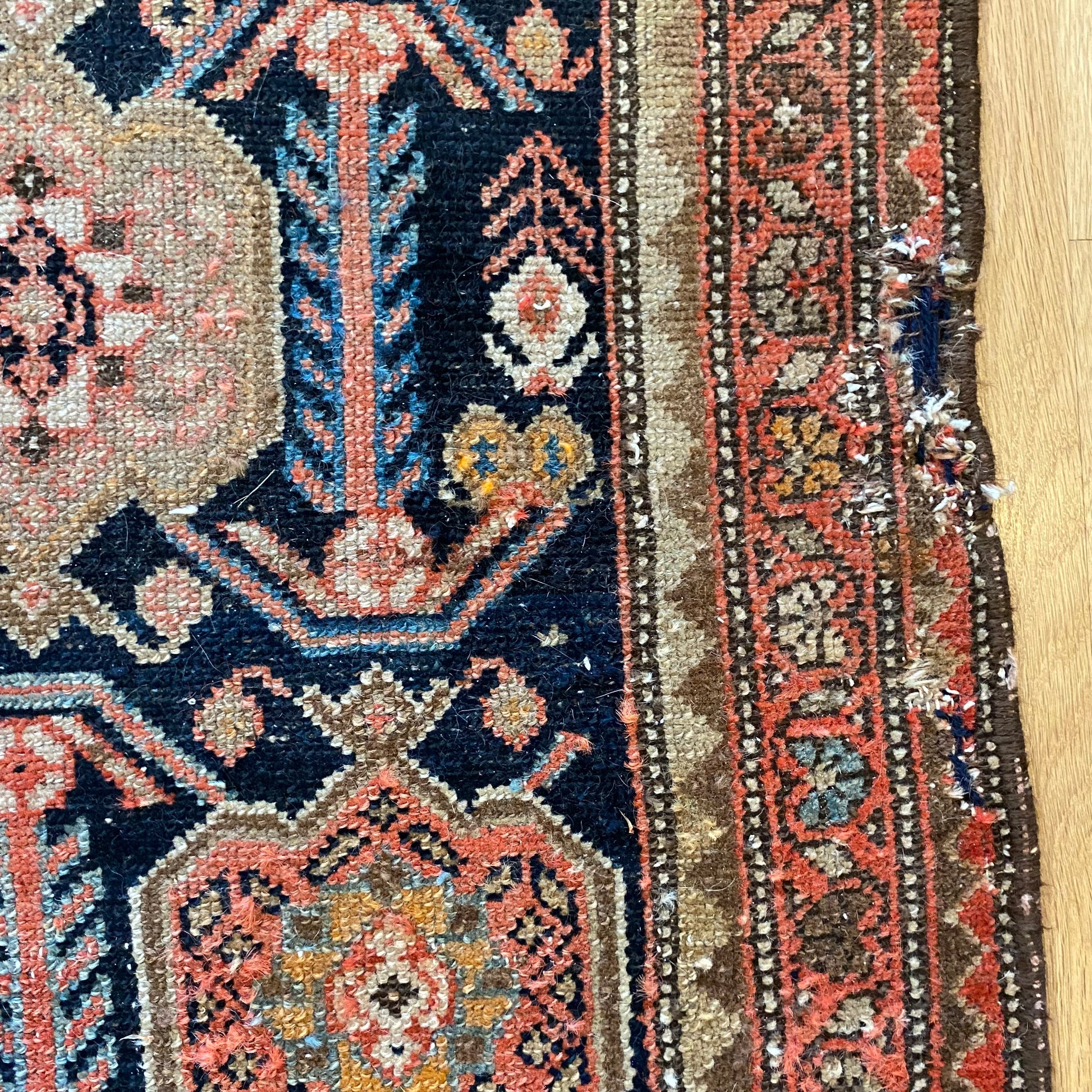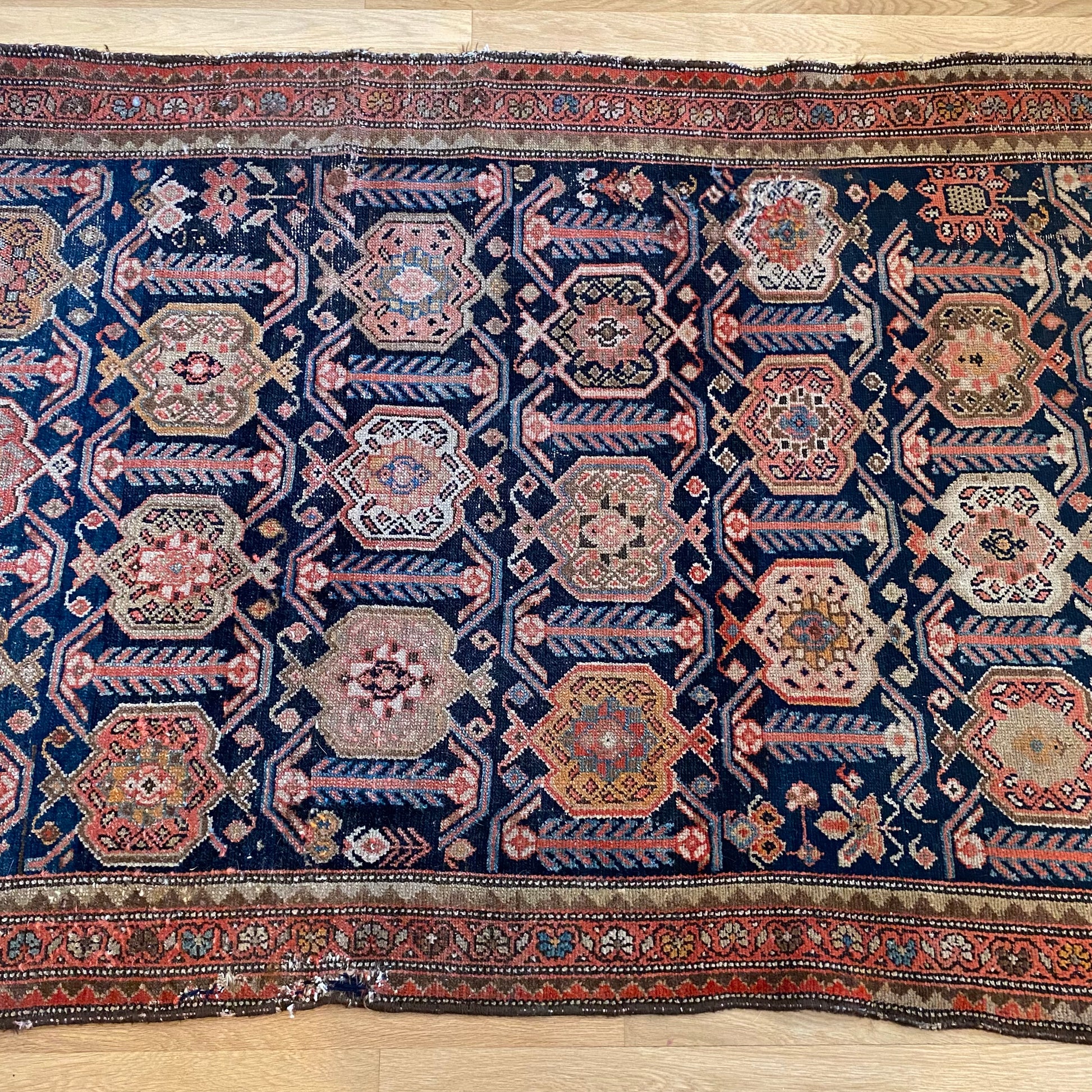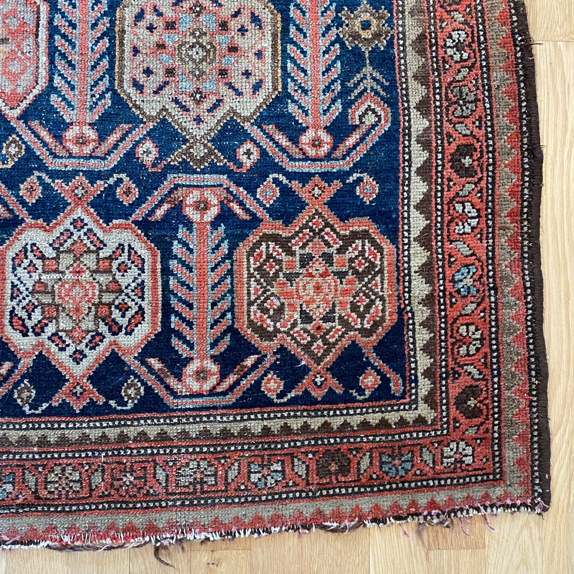 This vintage rug is in good condition. The design features an all-over pattern set in a blue field with brown and red highlights. There is wear on the edges, fringe ends and throughout. There is a small repair on one edge as seen in the photos.