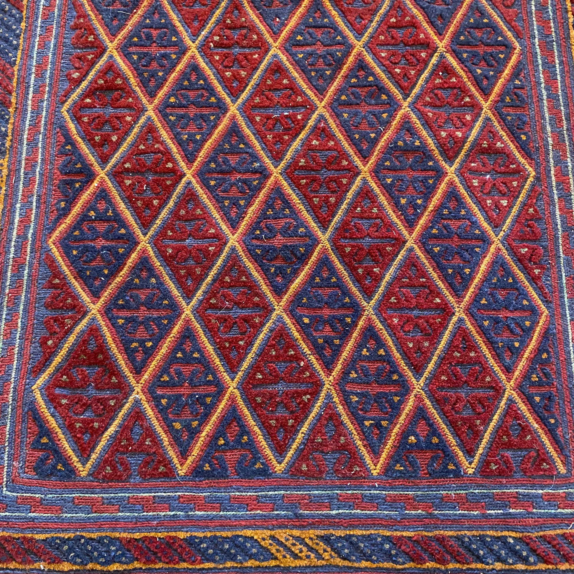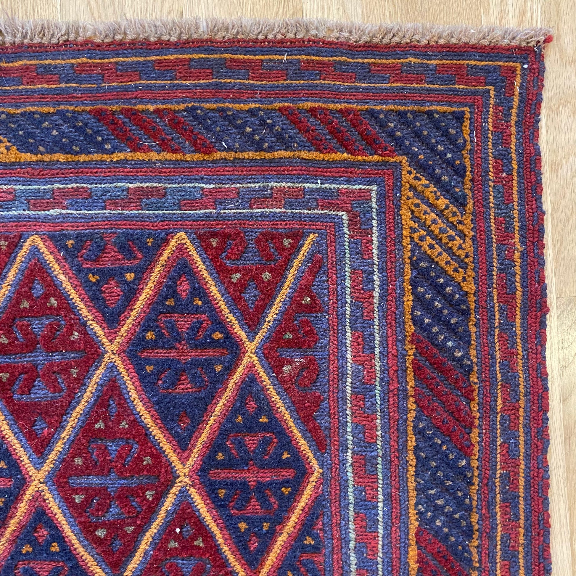 This vintage rug is in very good condition. The design features an all-over tribal pattern set in a blue field with red and dark gold highlights. There is light wear throughout.