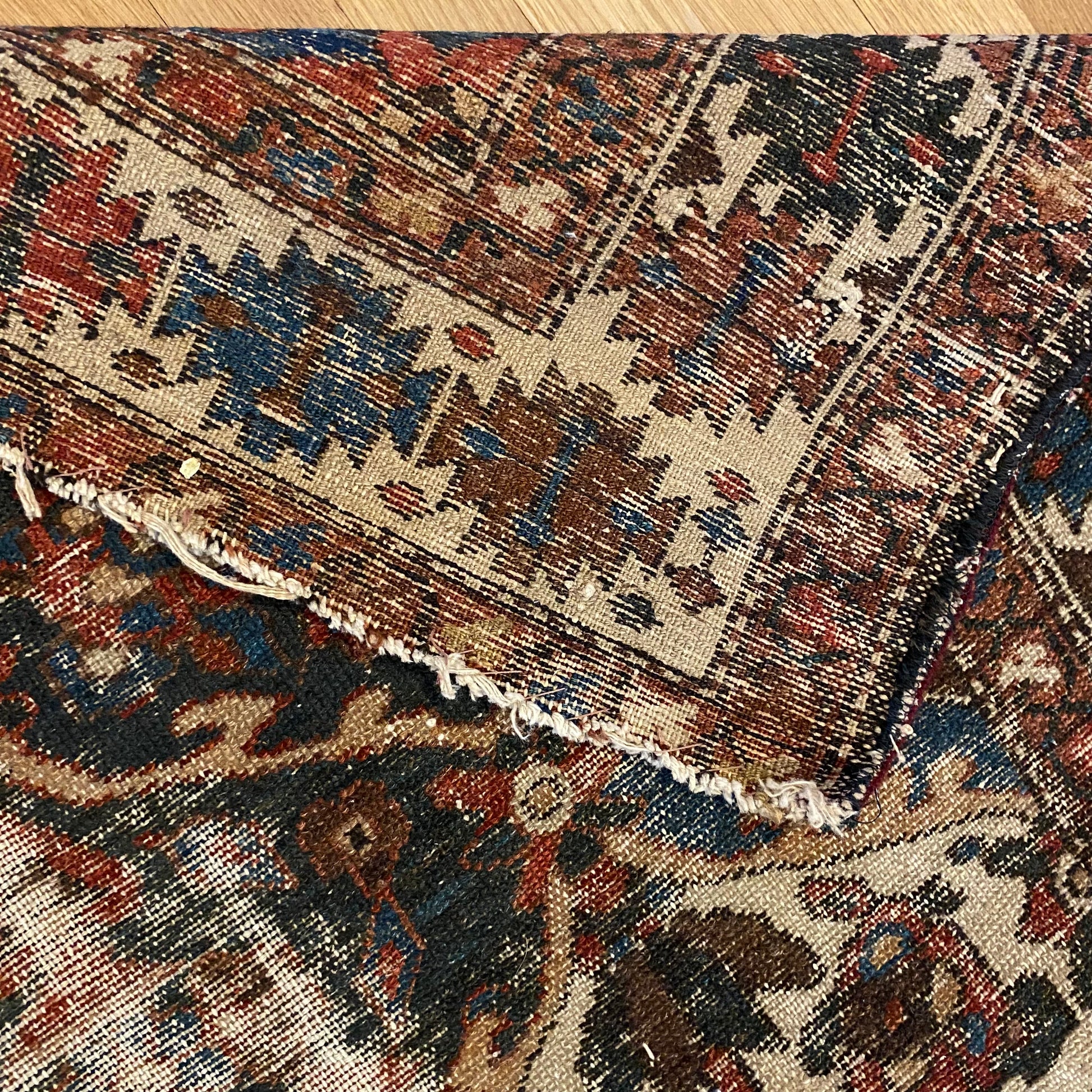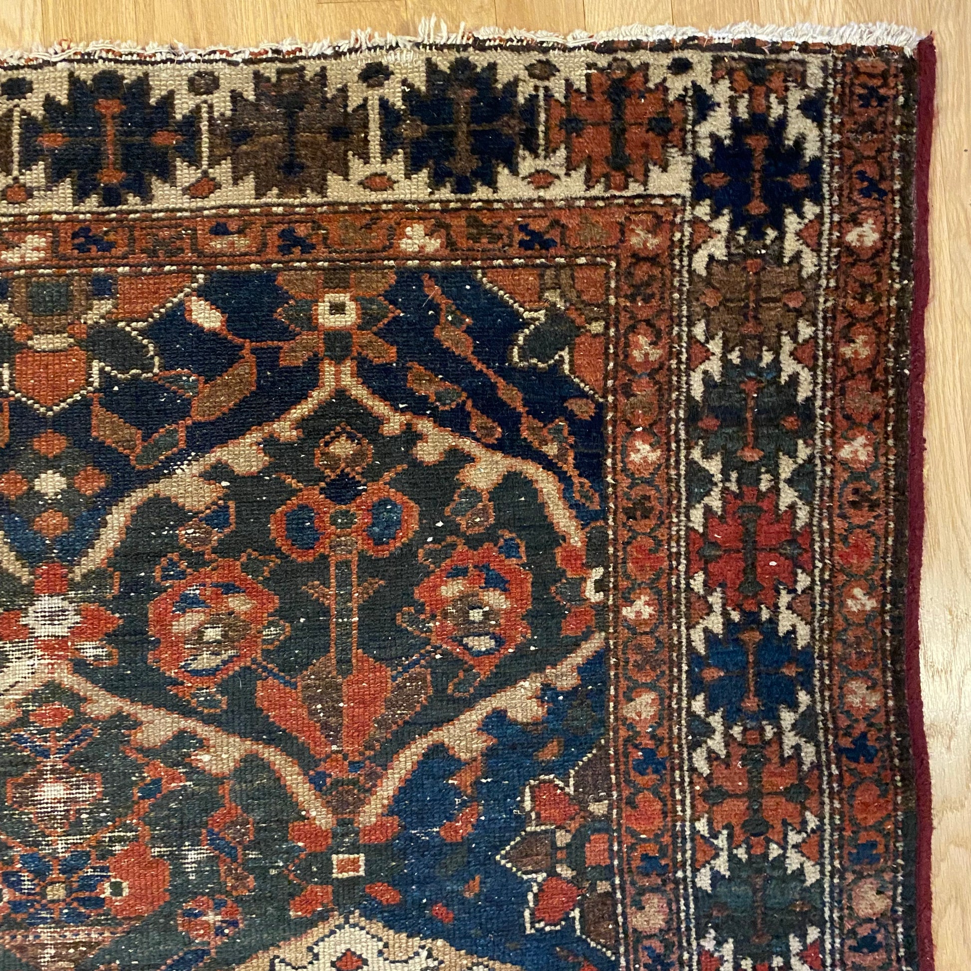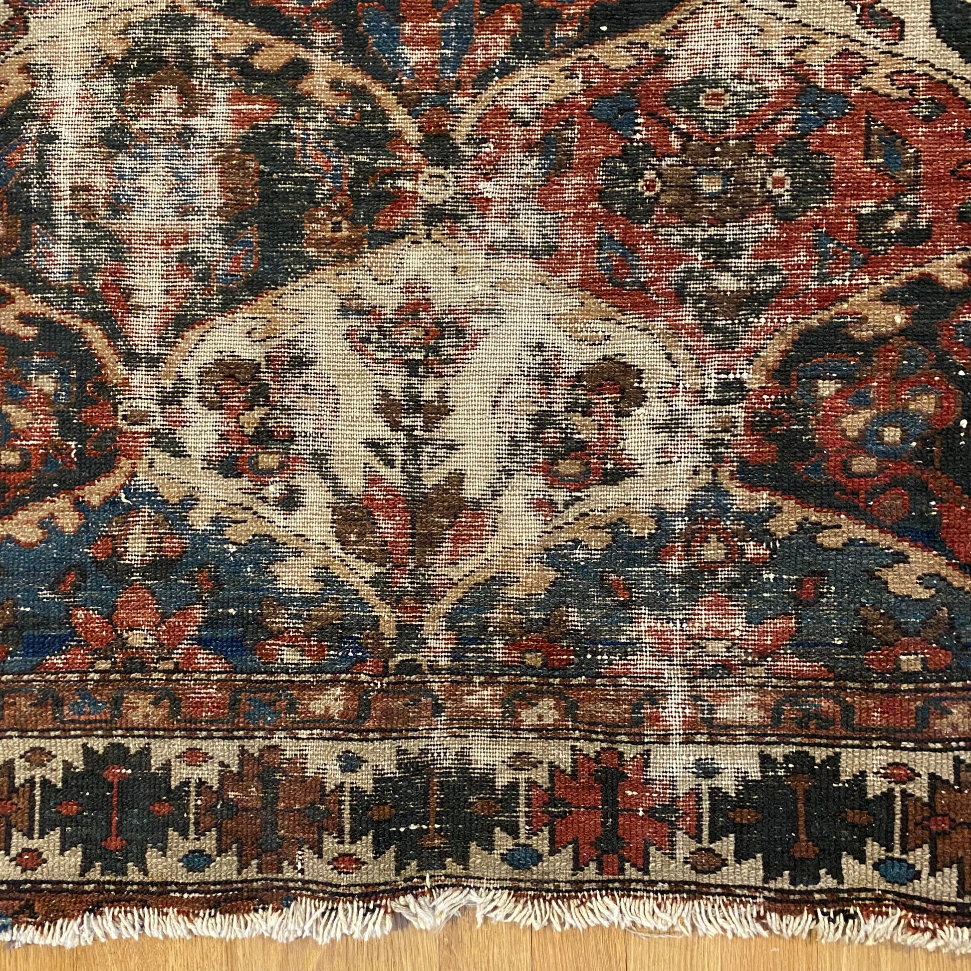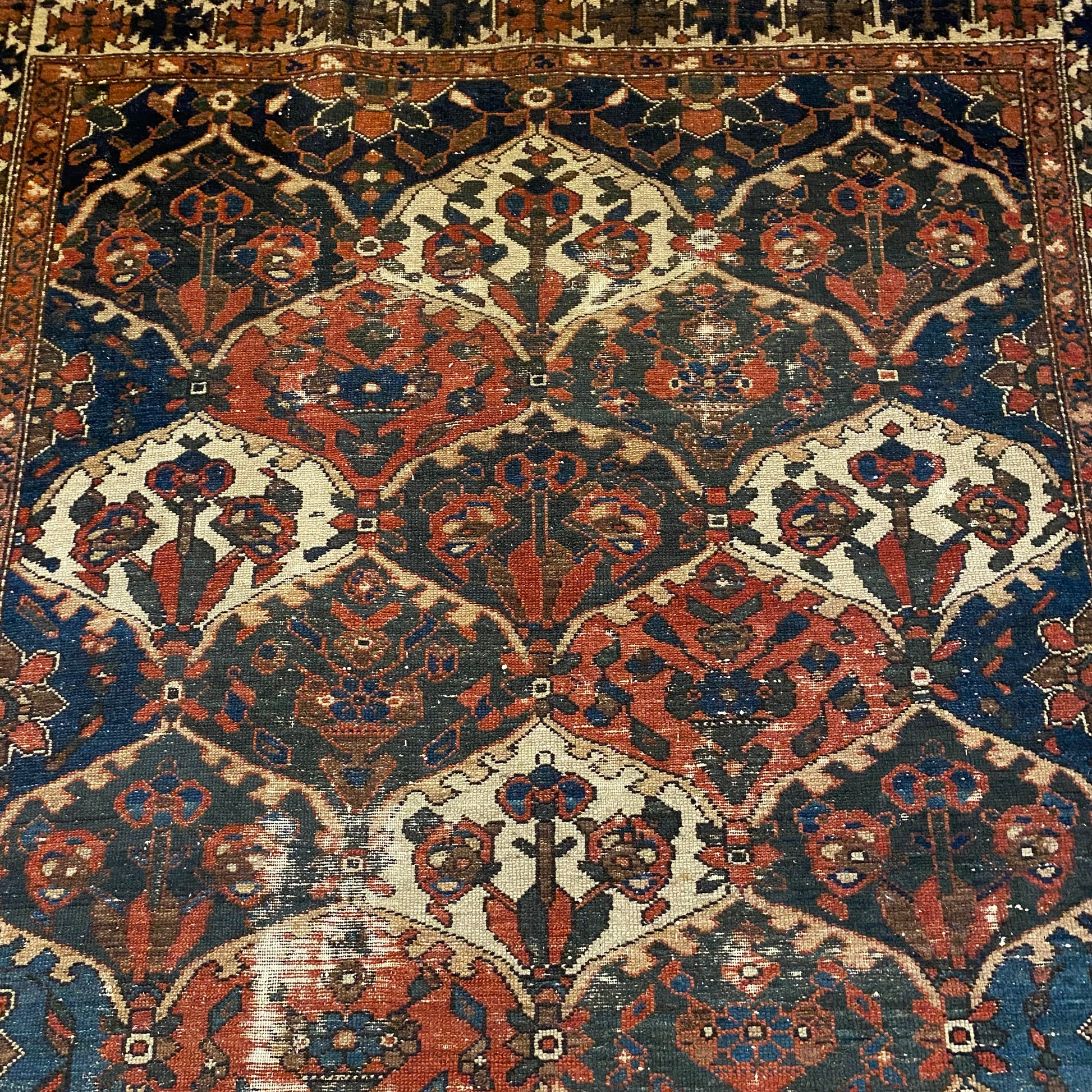 This vintage rug is in fair condition. The design features an all-over garden pattern with white, blue and red highlights. There is wear throughout as seen in the photos. There are new edges sewn on.
