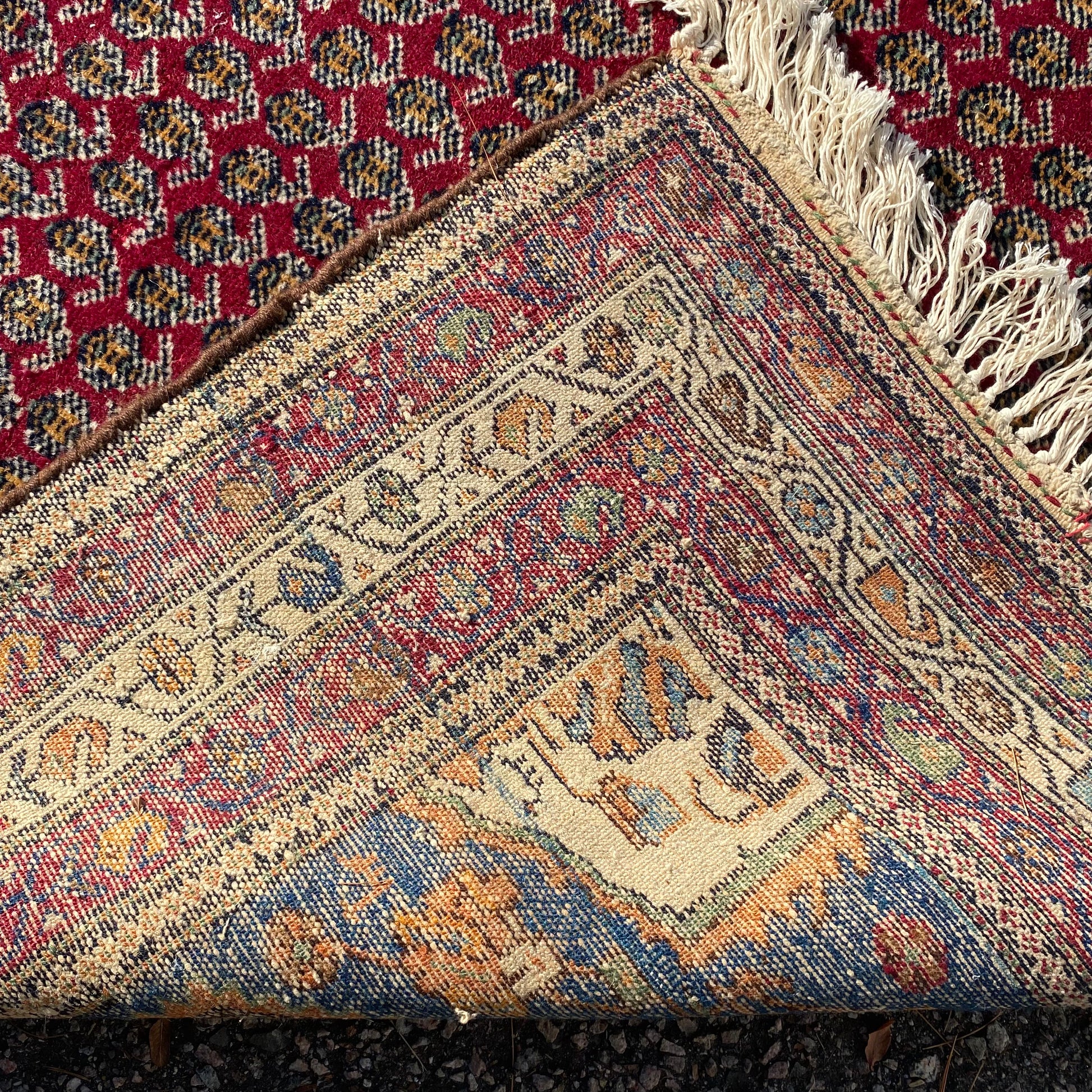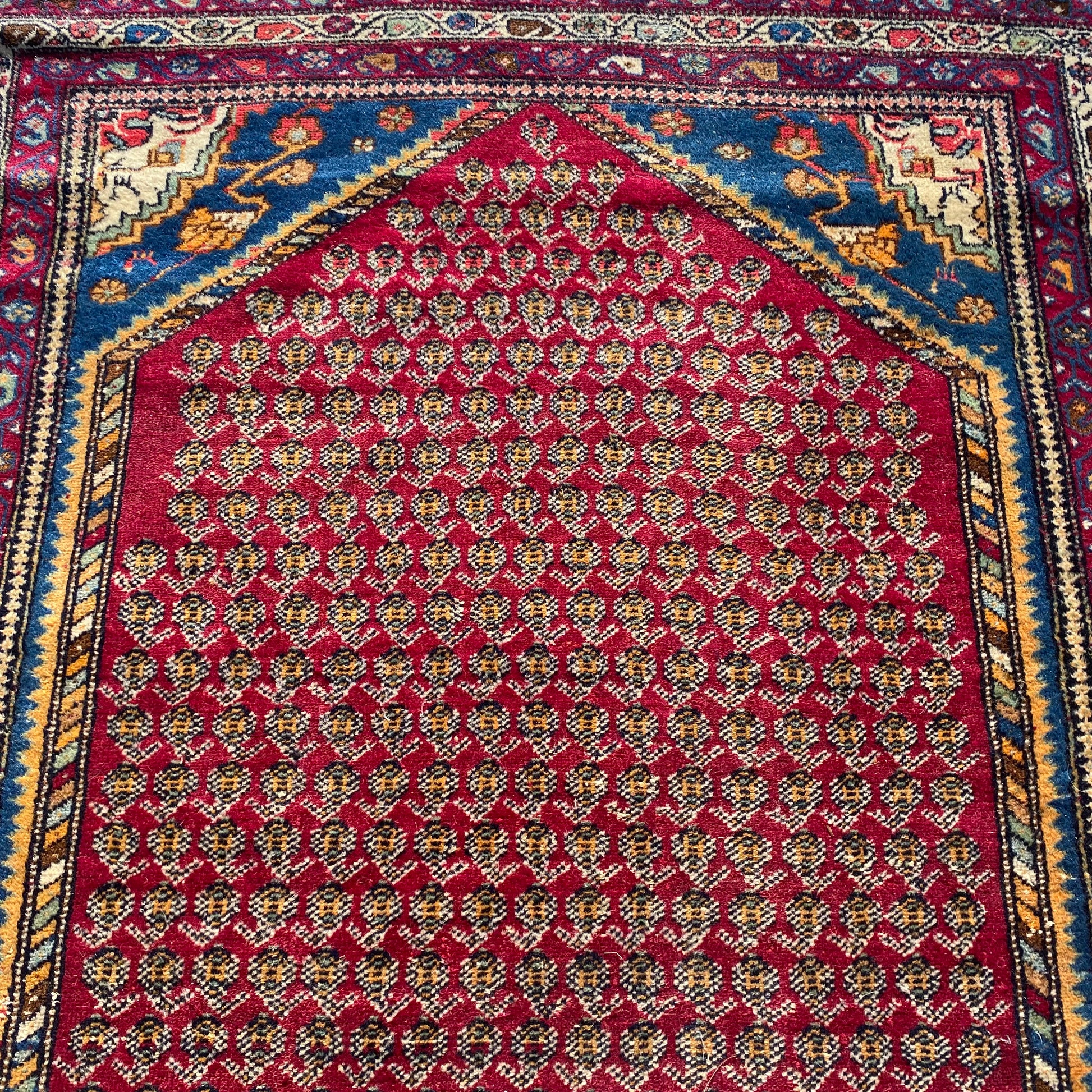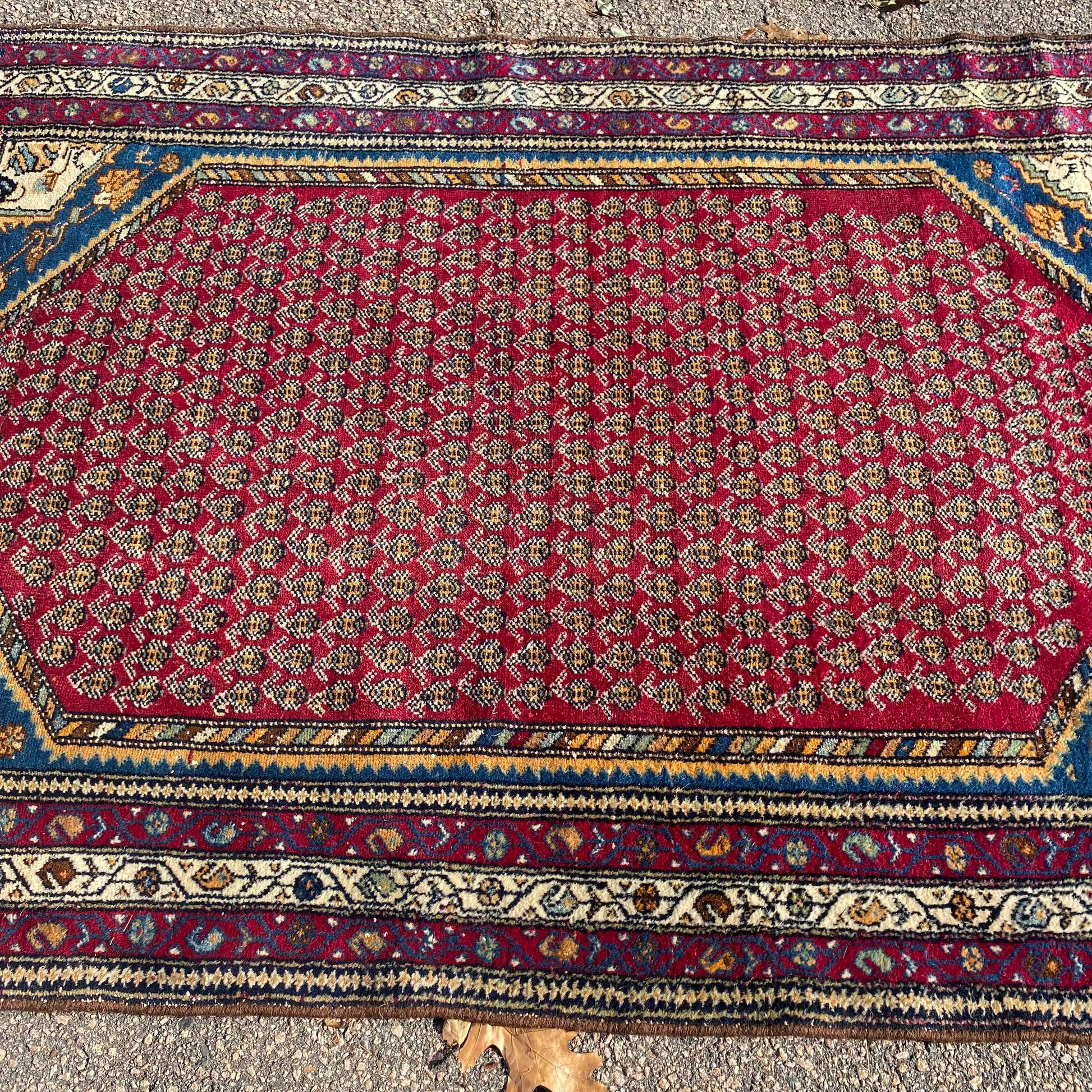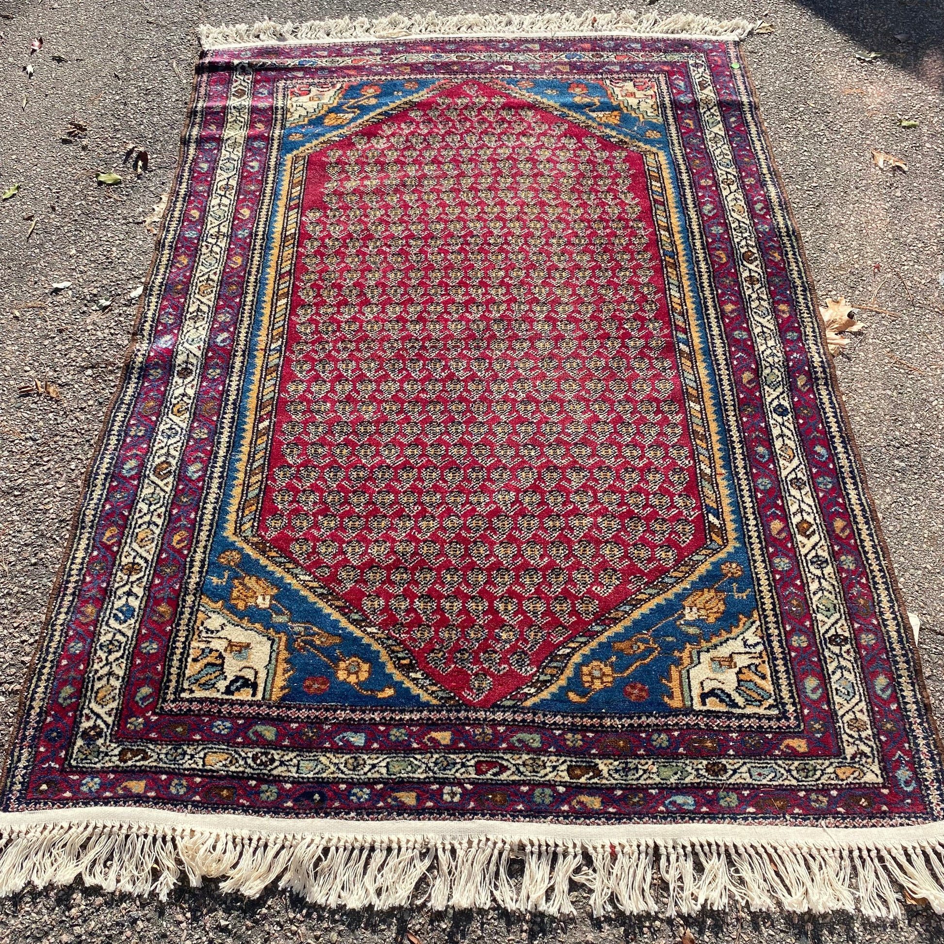 This vintage rug is in good condition. The design features an all-over pattern set in a red field with blue and white highlights. There is even wear throughout and new fringe as seen in the photos. The measurements include the fringe ends.