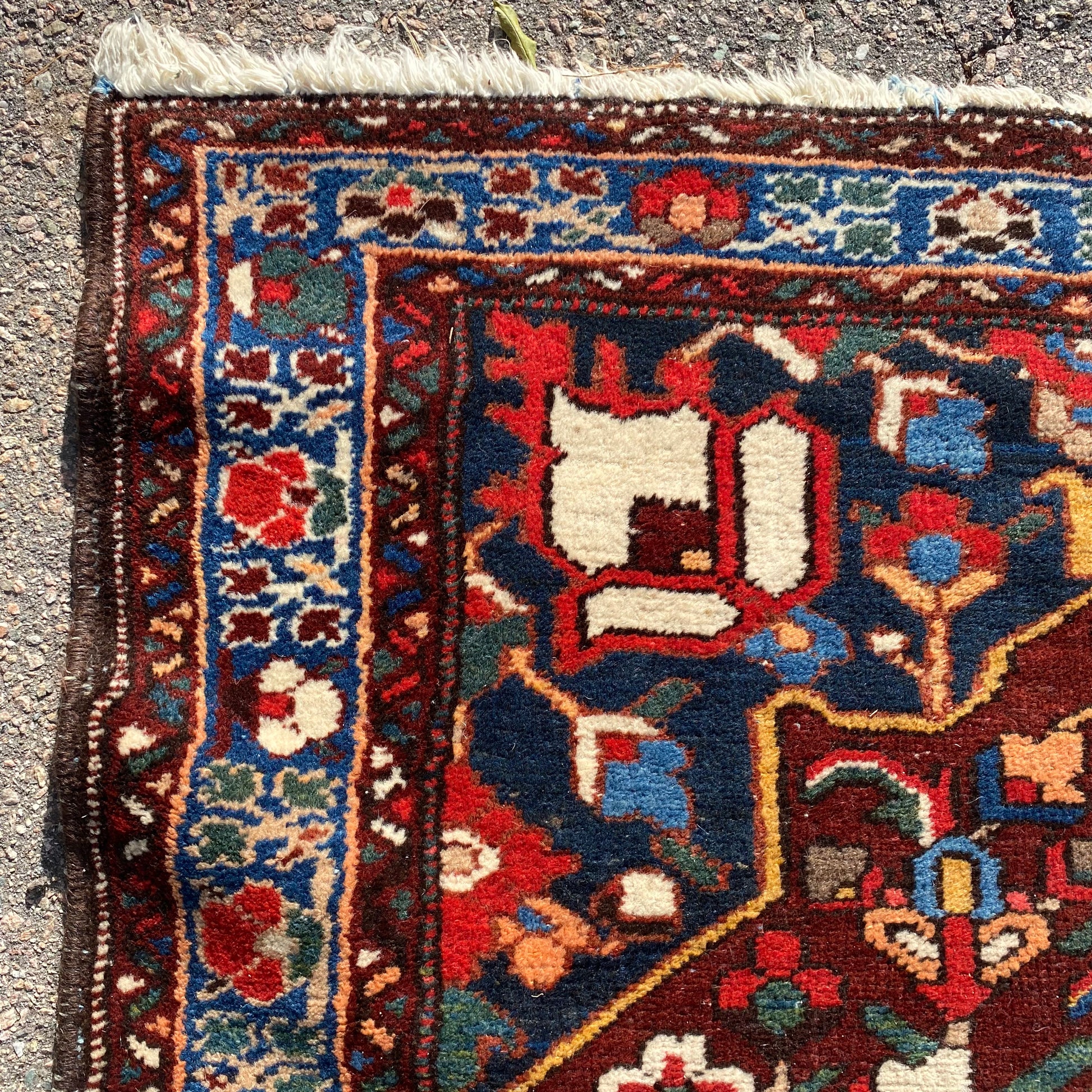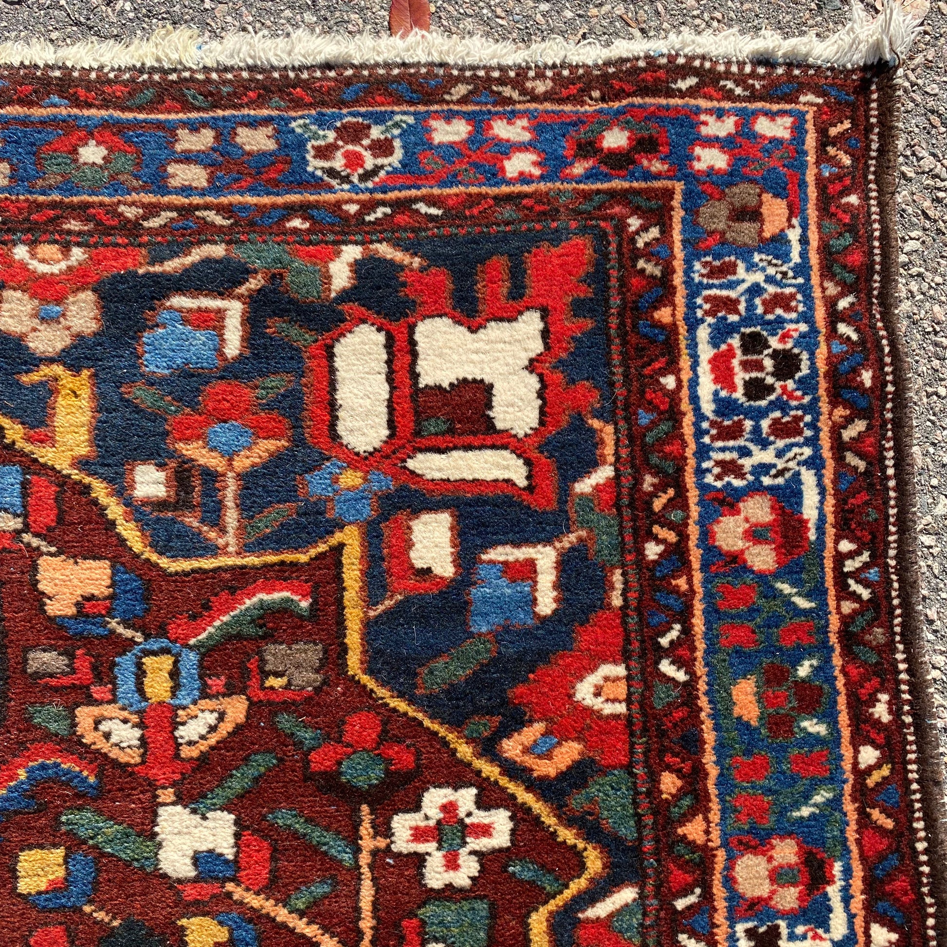 This vintage rug is in very good condition. The design features a central medallion set in a blue field with red-brown and white highlights. There is even wear throughout.