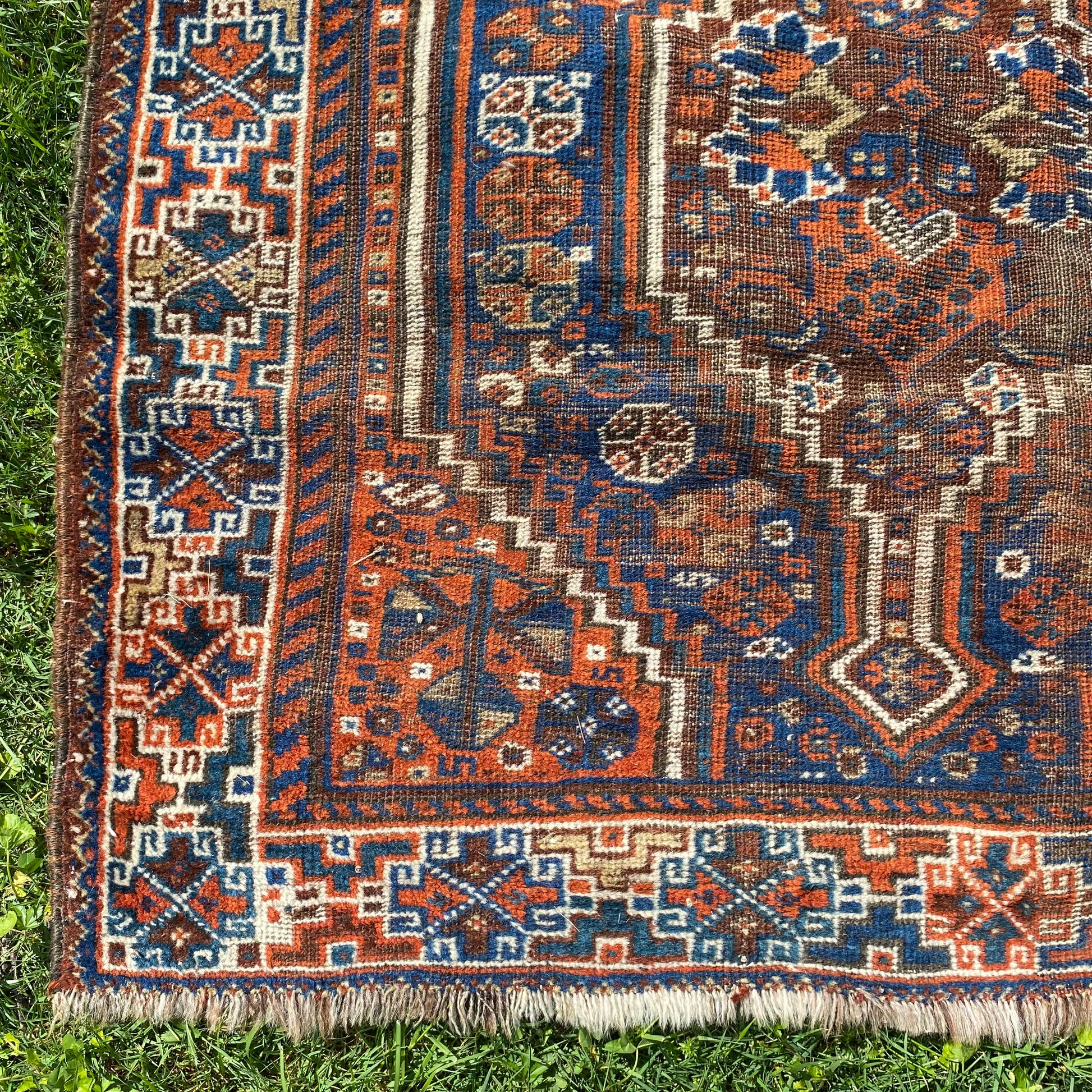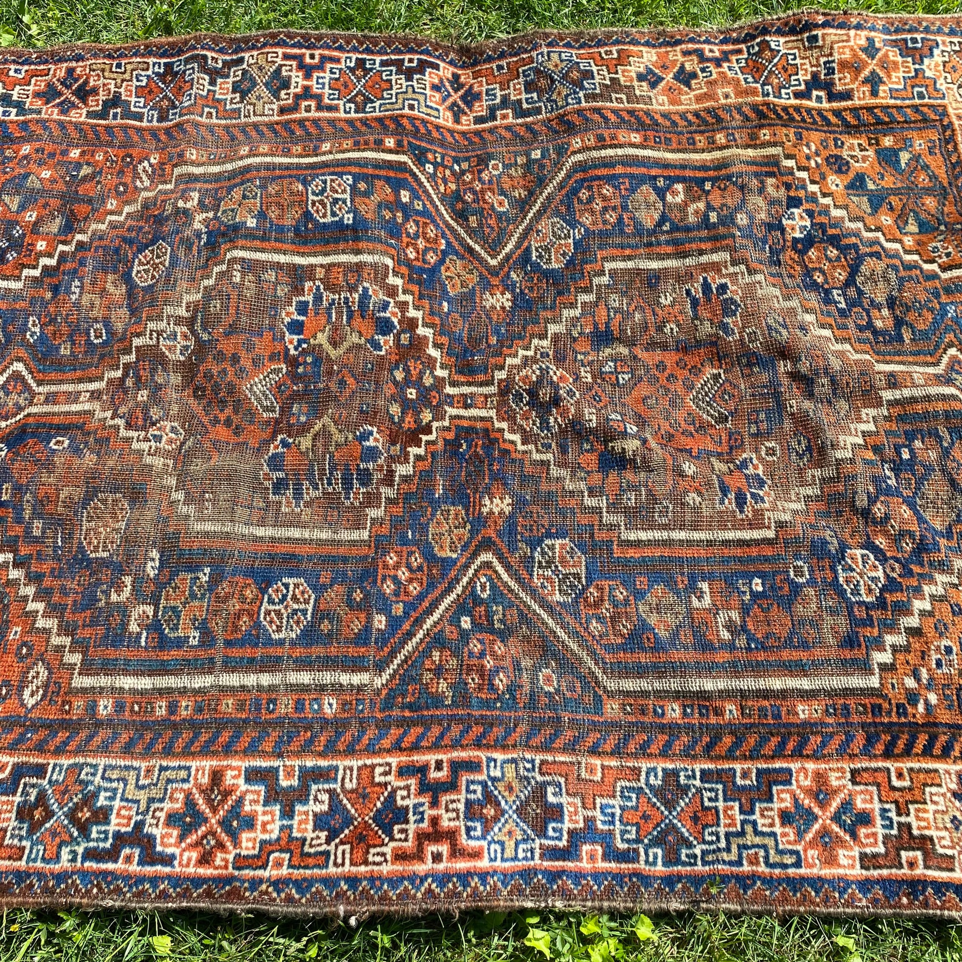 This vintage rug is in good condition. The design features tribal medallions set in a blue field with white and orange brown highlights. There is wear throughout.