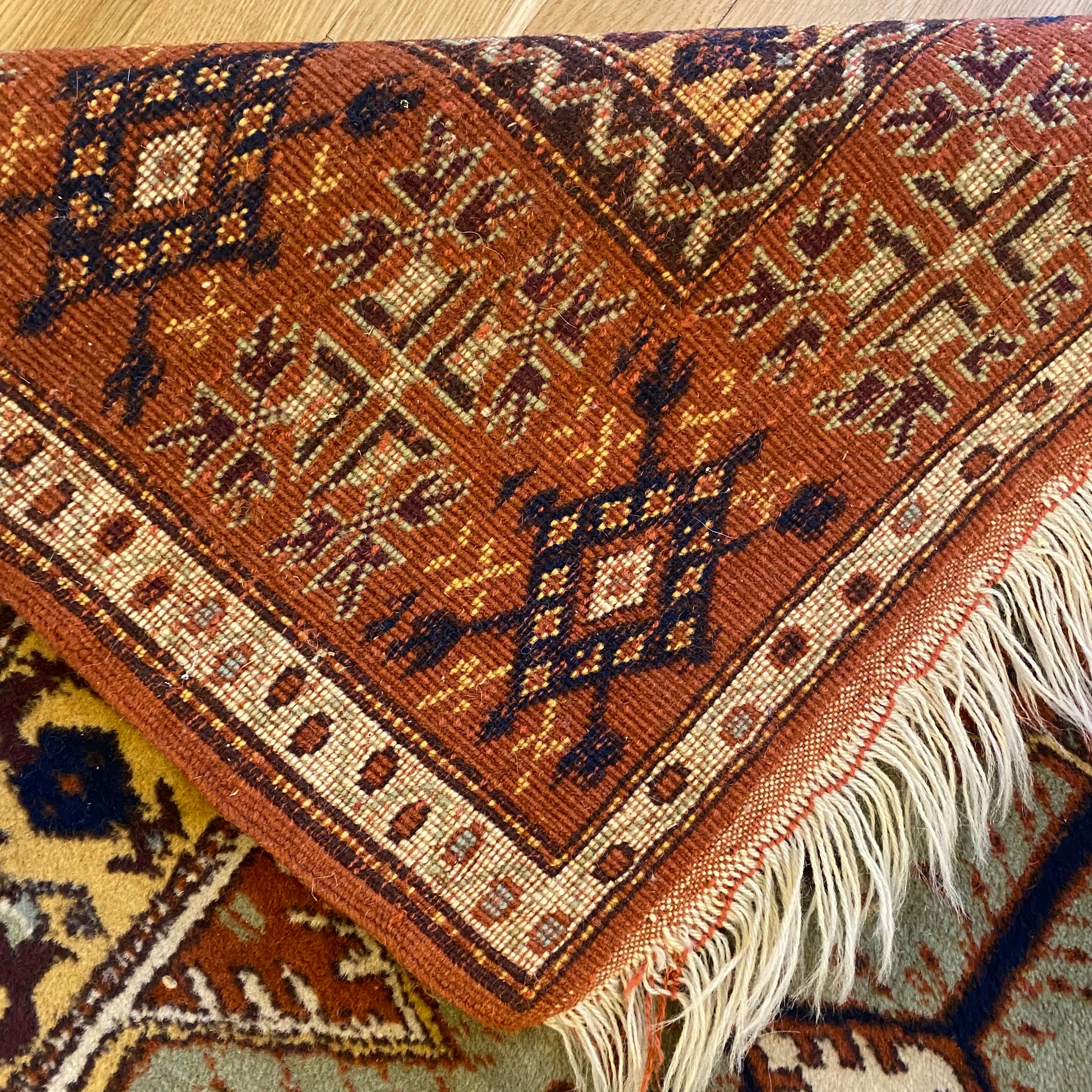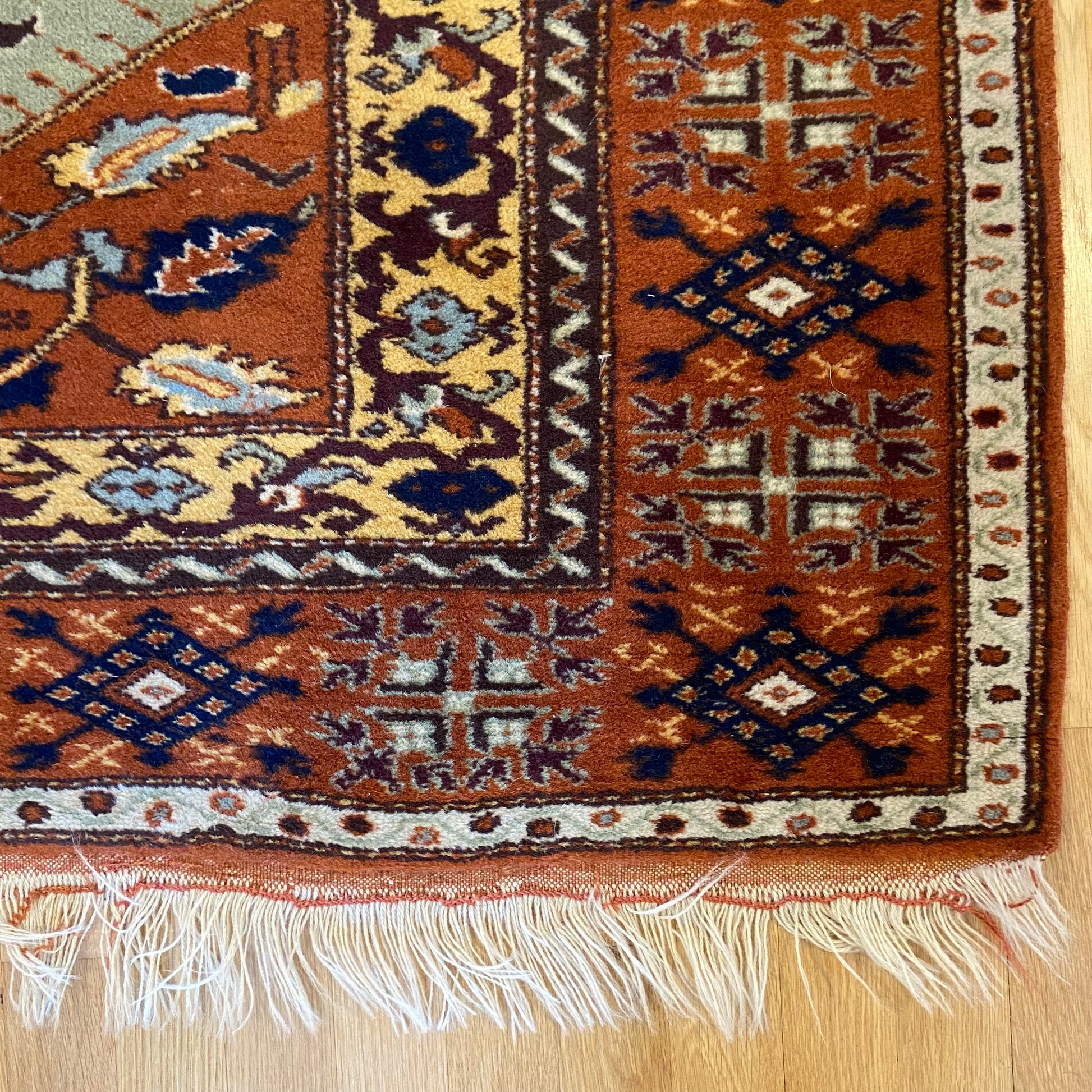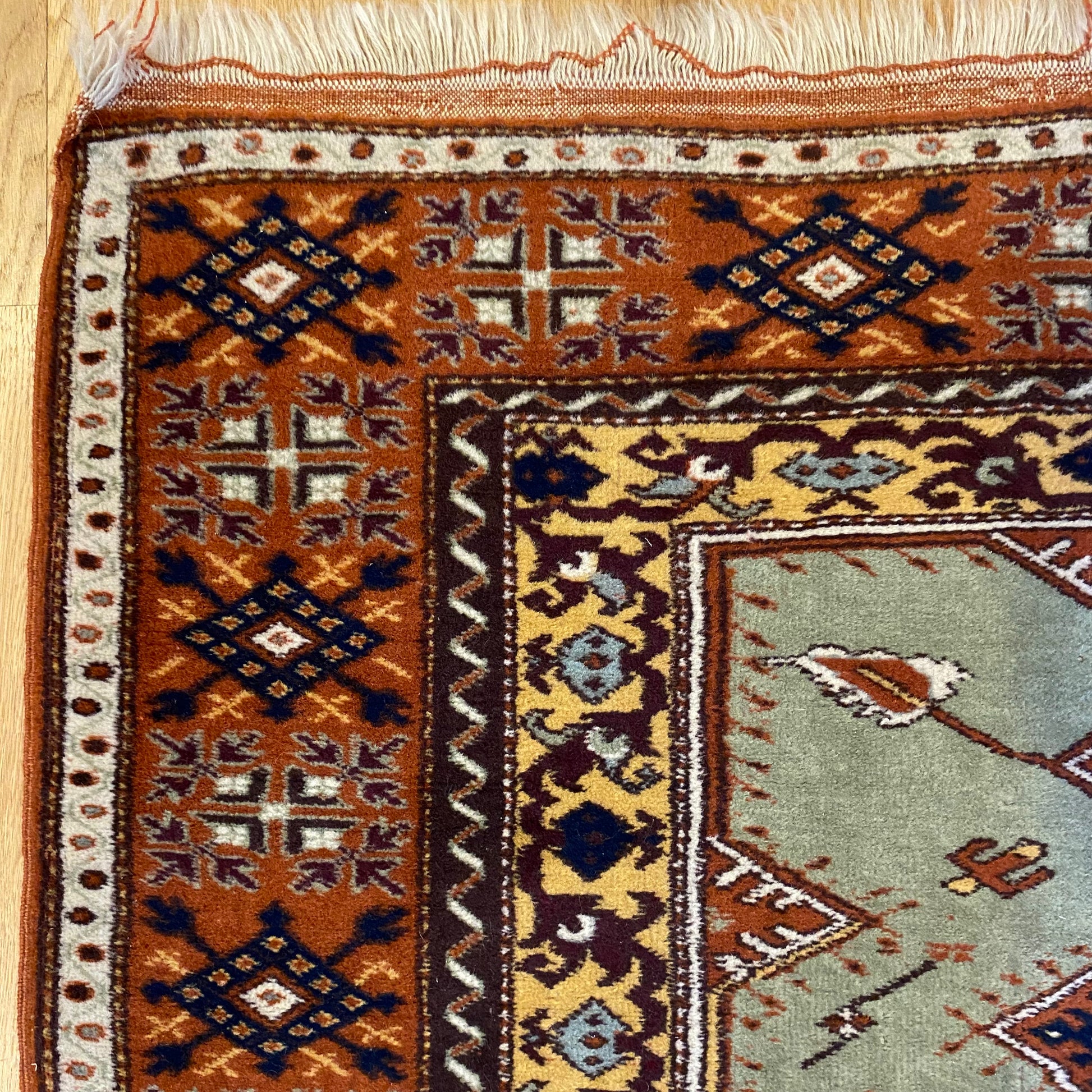 This vintage rug is in very good condition. The design features a tribal pattern with a prayer design set in a soft green field with brown, yellow and white highlights. There is wear on the fringe ends and even wear throughout.