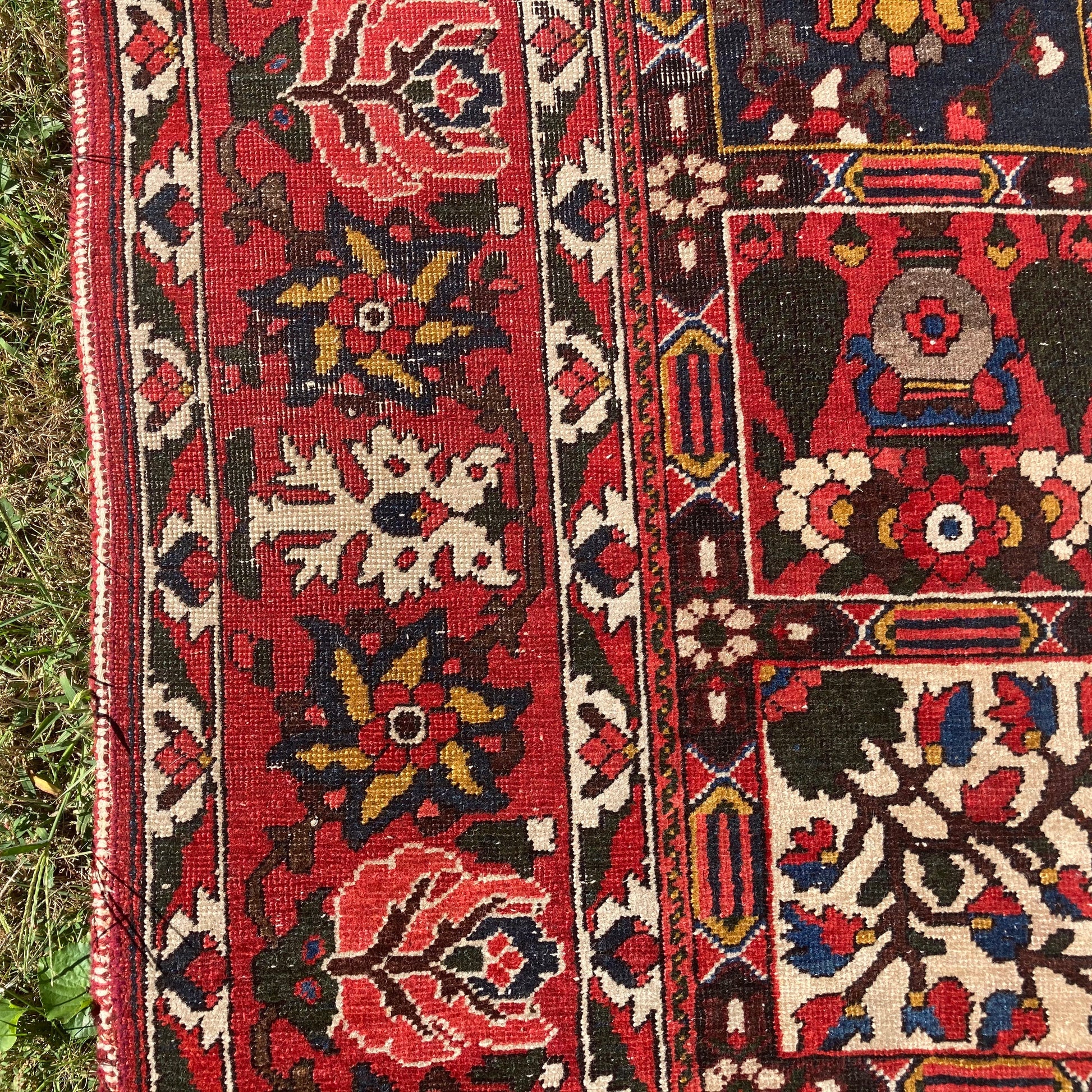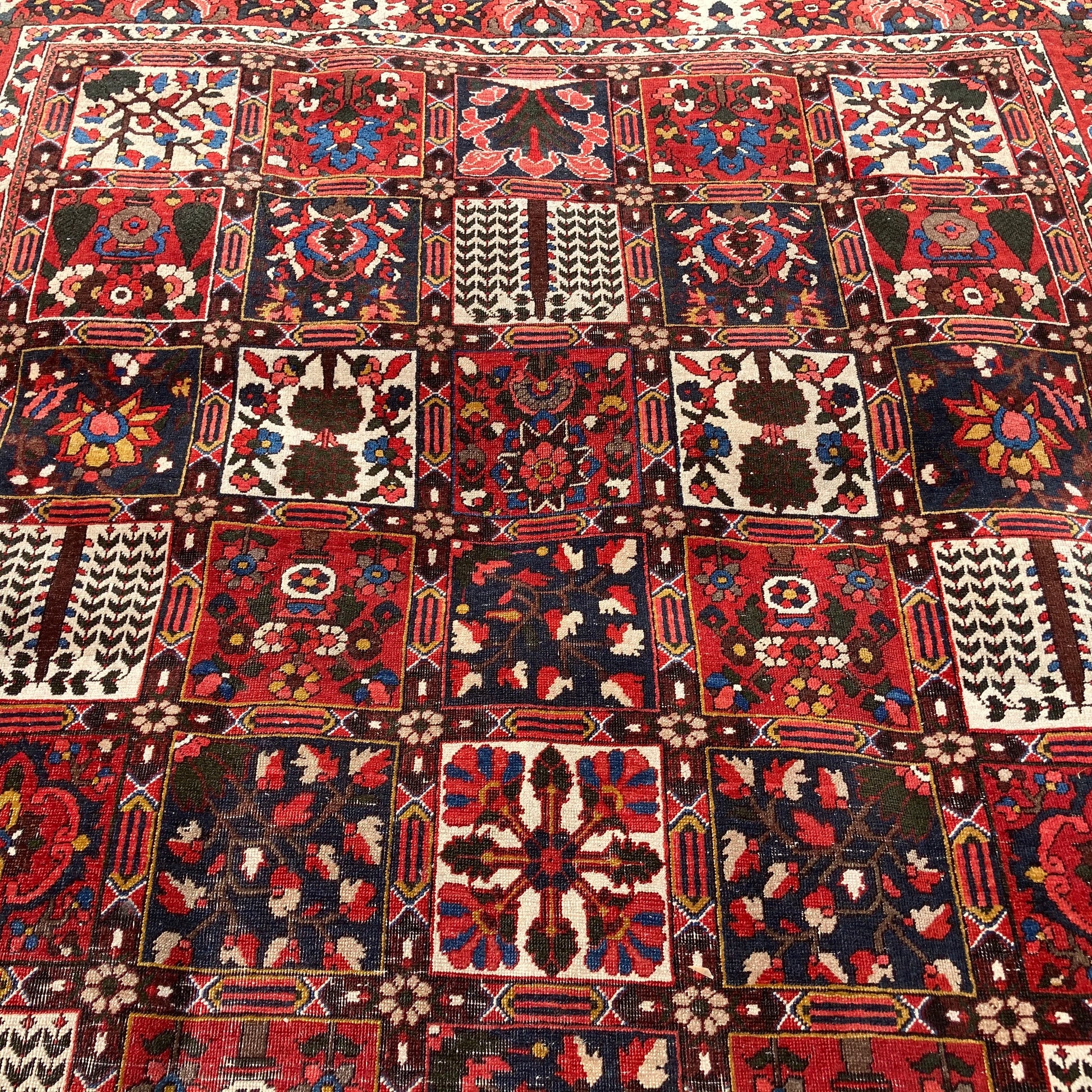 This Persian Bakhtiari rug is in very good condition. The design features an all-over garden panel pattern with red, blue, white and pink highlights. There is even wear throughout and wear on the edges and fringe ends.